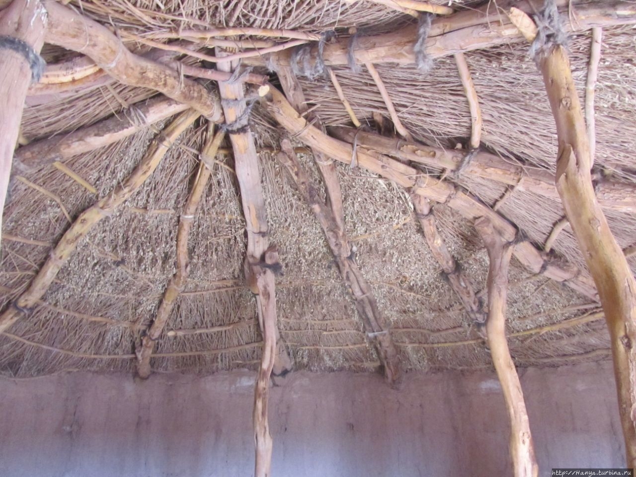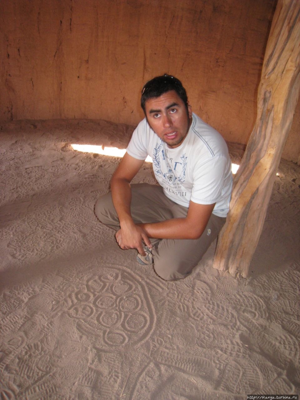 Себастьян заводит нас в цилиндрическое глинобитное сооружение, воссозданное с элементами прошлых веков, и рисует на песке схему строительства архаичных домов, характерную для зарождения оседлого образа жизни того времени и которые мы вскоре увидим воочию.