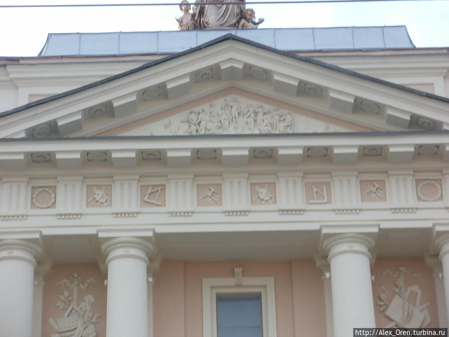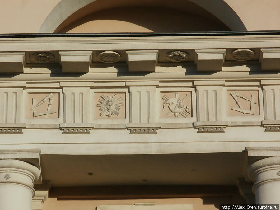 На аттике здания мы видим угольник с циркулем, палитру, солярную розетку, молоток, резец. Для непосвящённых — орудия труда живописцев и ваятелей, для посвящённых — масонские знаки.