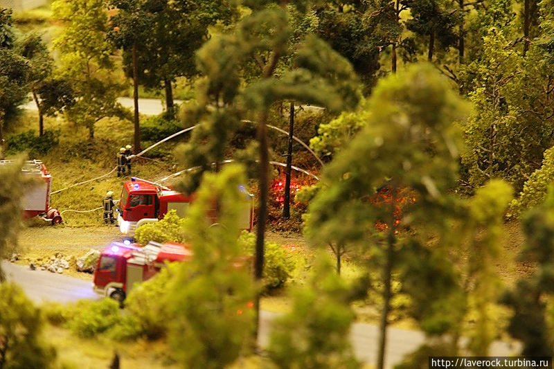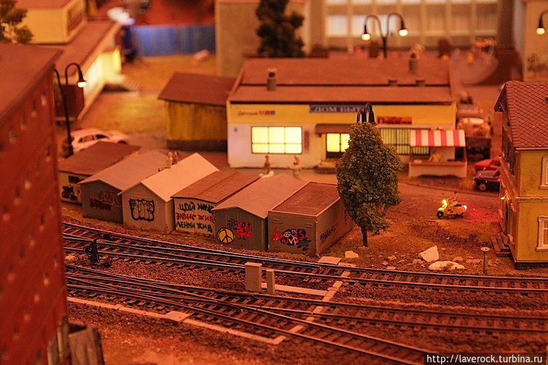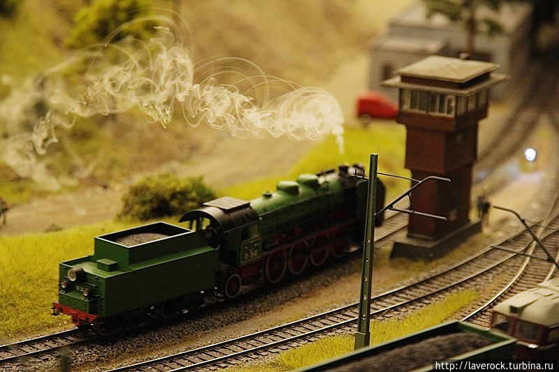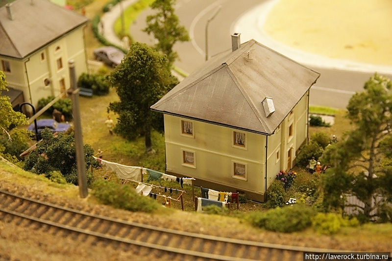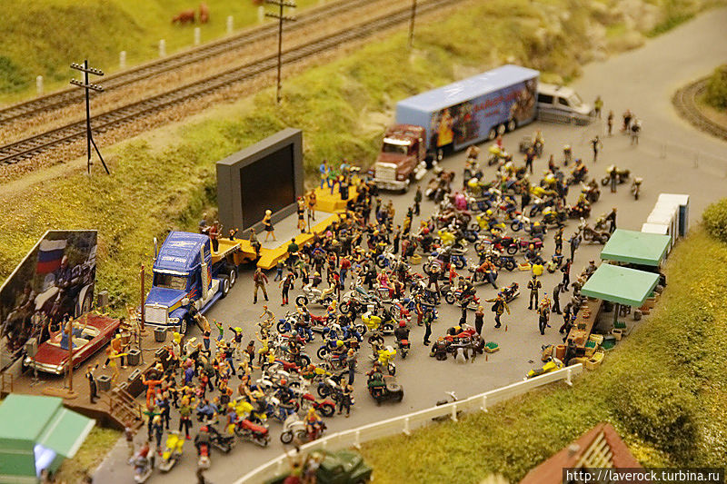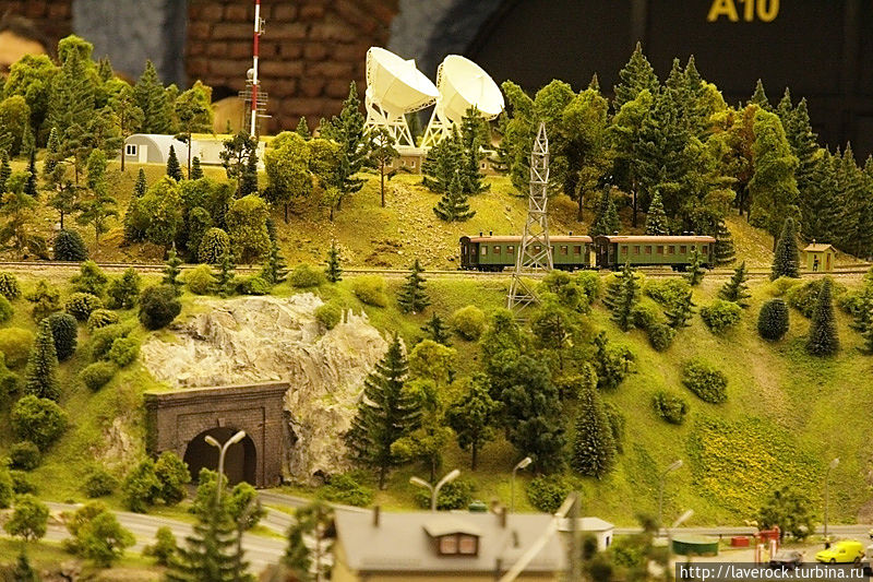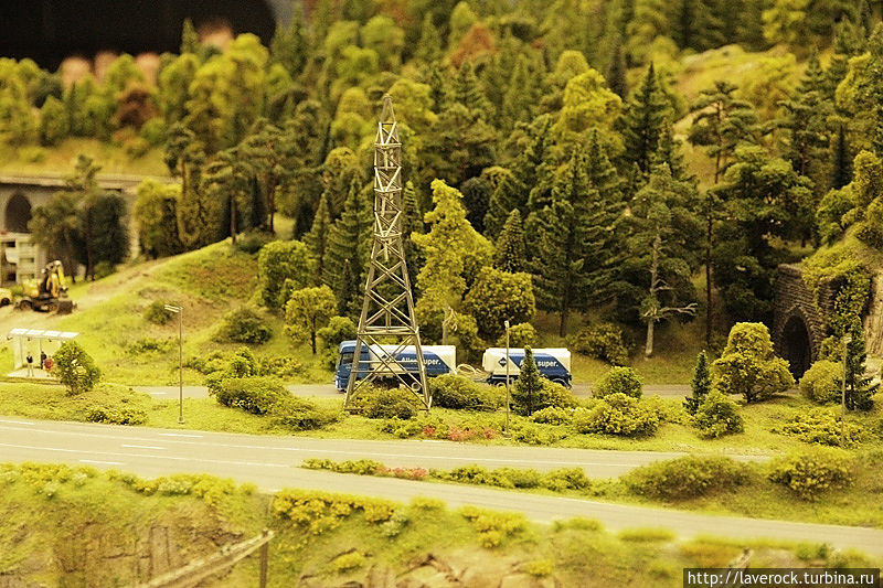 Это макет России площадью 800 квадратных метров, от Калининграда до Владивостока. Все условно, все объекты и регионы являются собирательными, но макет дает представление о том, что такое наша Раша, со всеми ее лесами, поездами, деревнями, бездорьжьем. Хотя, как раз дороги тут неплохие, по ухабам не смогли бы ездить машинки коих тут в большом количестве. Машинки именно ездят, не стоят. Автобусы сами останавливаются на остановках.