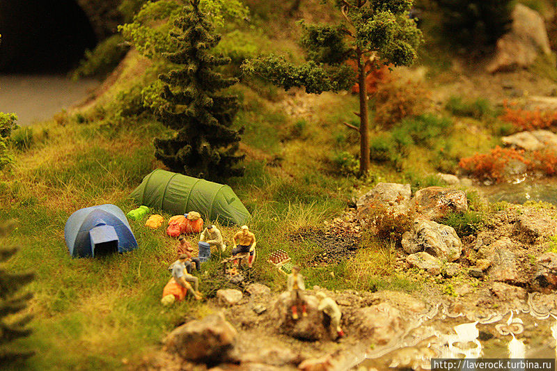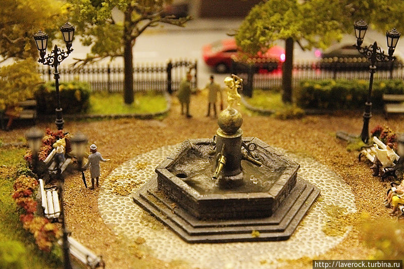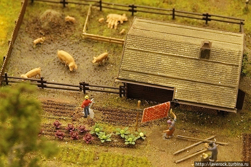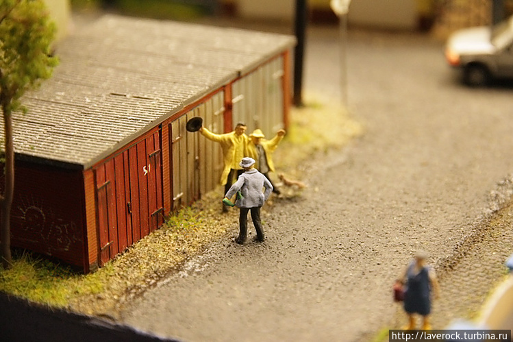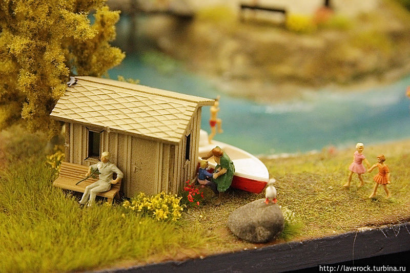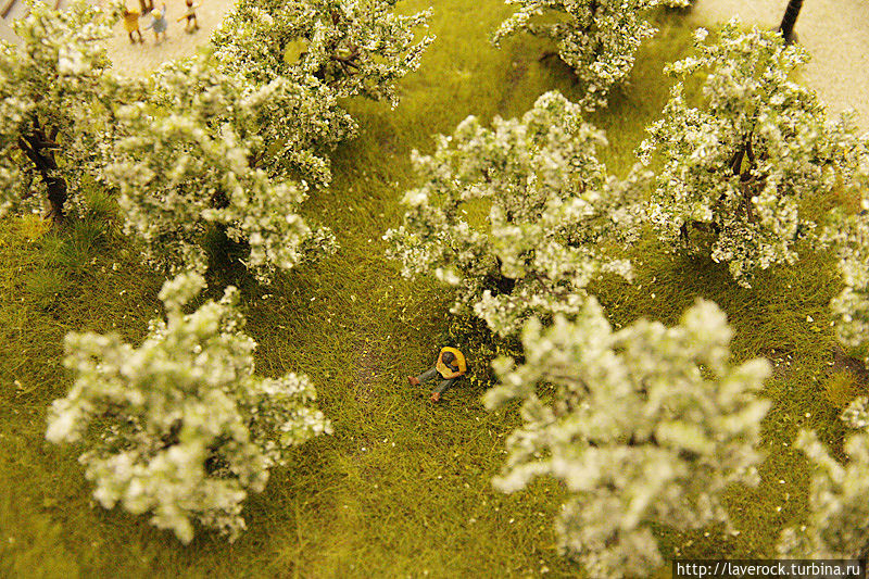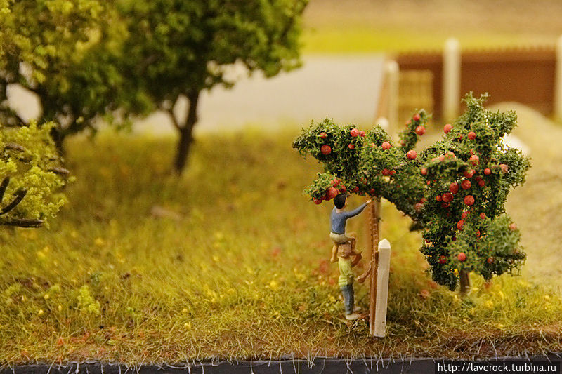 Первое место в моем рейтинге досталось сцене, где мамашка в укромном уголке держит ребенка над травкой)). За углом сидит на скамеечке романтично настроенный мужчина с розой. Чтобы было понятнее — рост взрослых людей составляет около двух сантиметров, просто невероятно кропотливая работа.