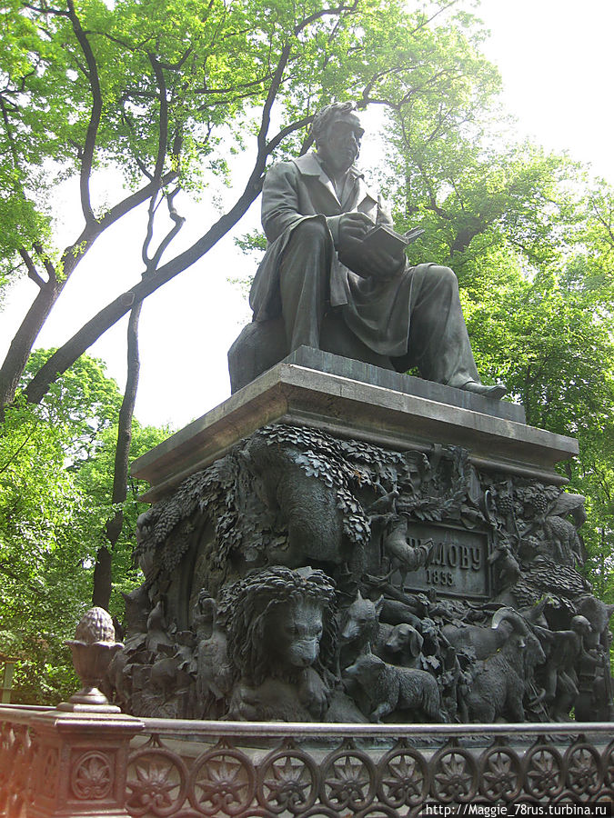 Пожалуй, больше всего я обрадовалась встрече на главной аллее со "старым знакомым" Баснописцем И.А. Крыловым. Бронзовая статуя работы скульптора барона фон Клодта установлена на гранитном пьедестале, украшенном бронзовыми изображениями лиц и животных — персонажей произведений Крылова.