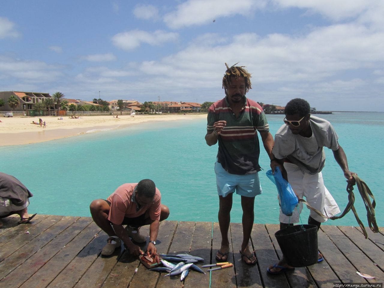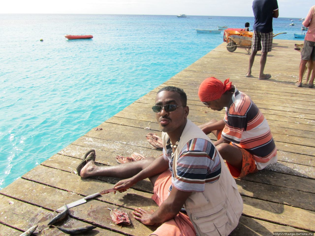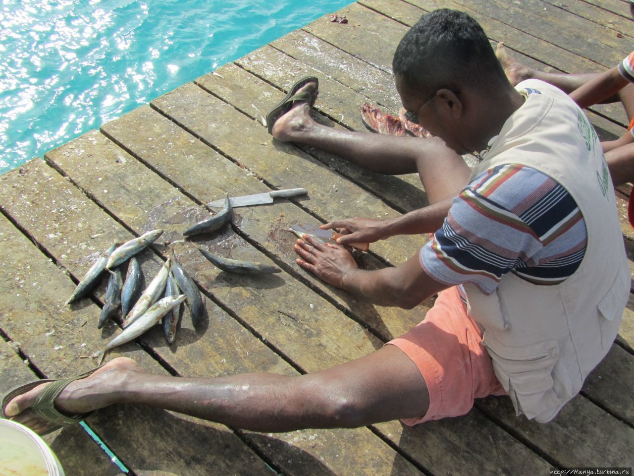 Немногочисленные рыбаки (?) чистят рыбу прямо на досках причала.