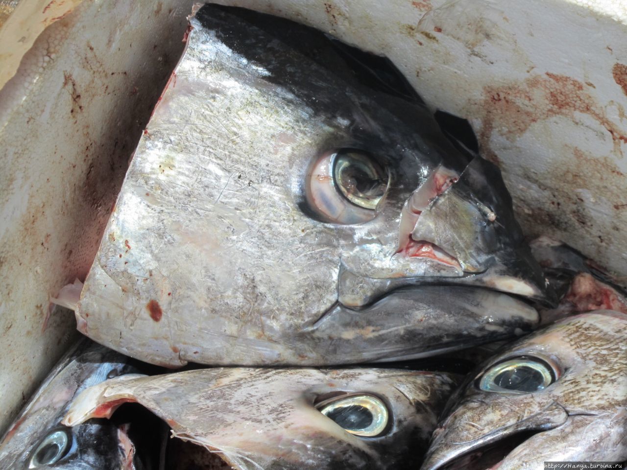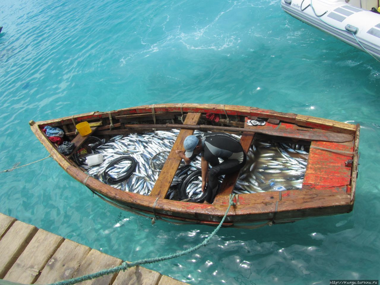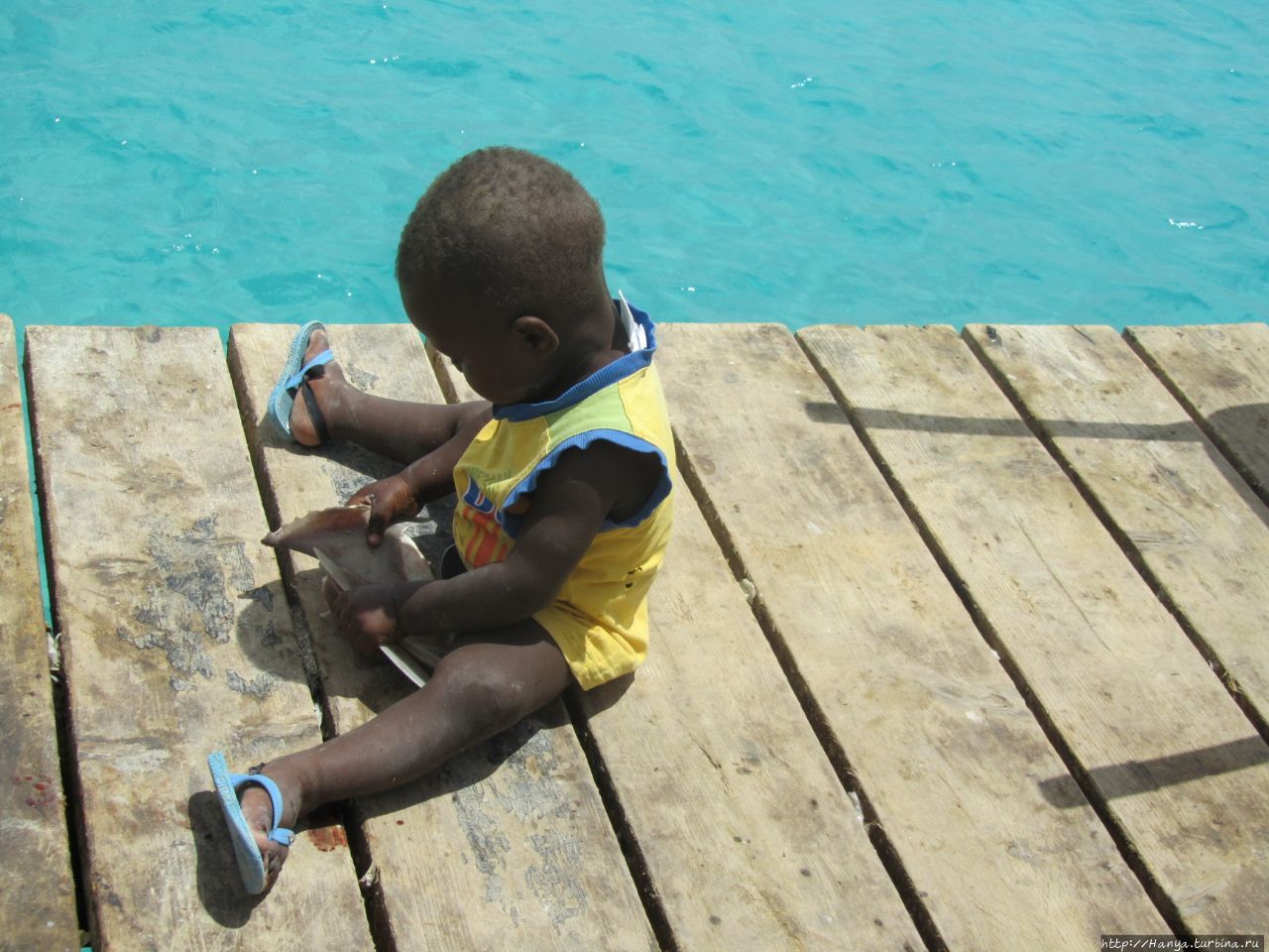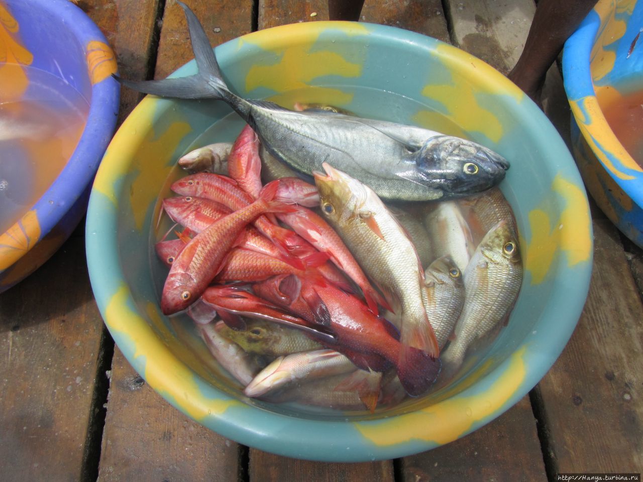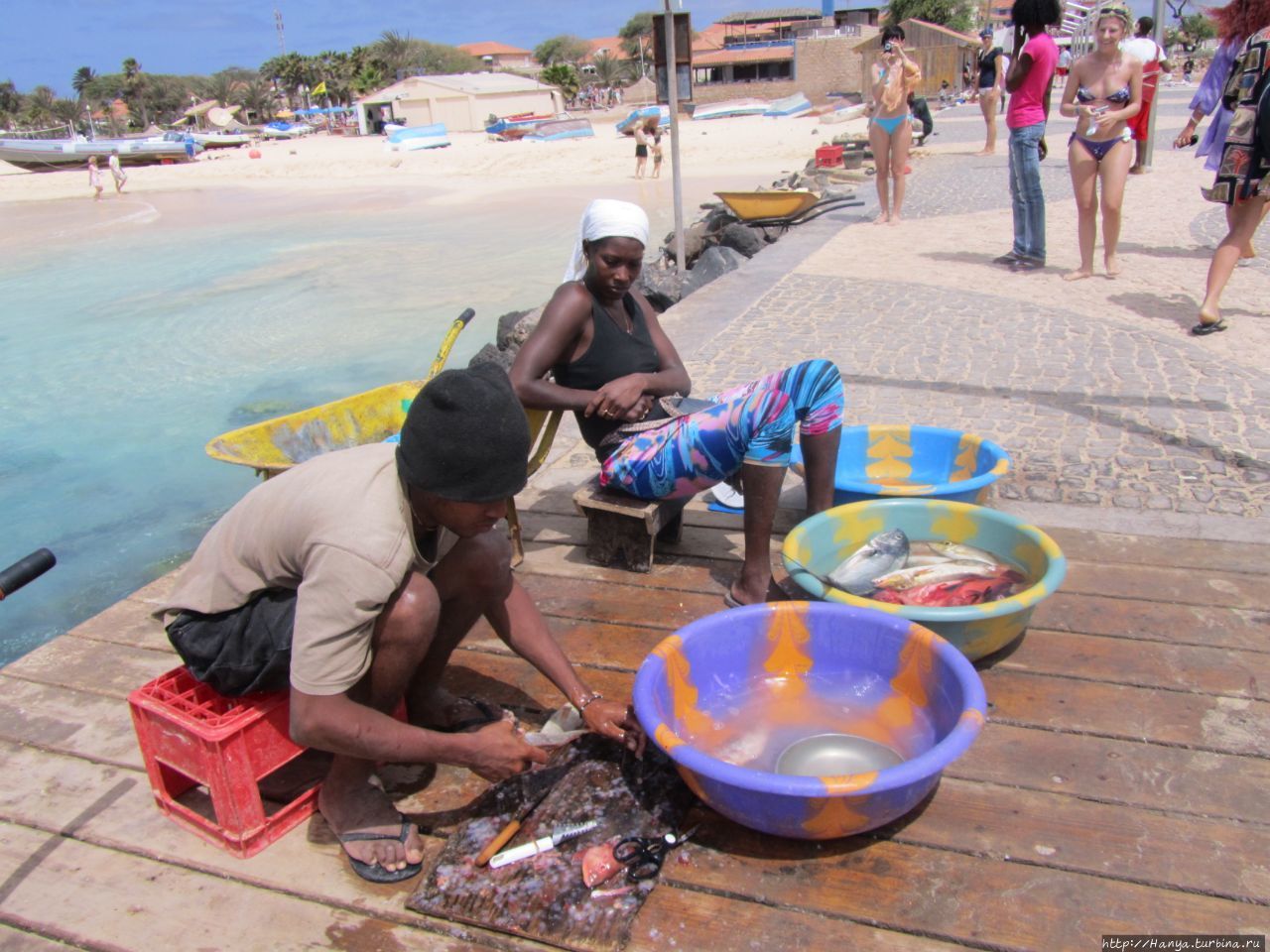 В цветастых тазиках плавают остатки утреннего улова, и худая жительница острова не теряет надежду продать остатки рыбы.
