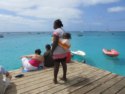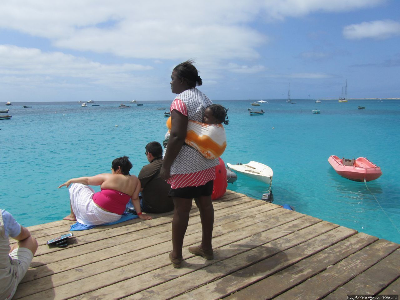 Другая темнокожая пампушечка держит юное поколение за спиной и высматривает в море свою лодку.