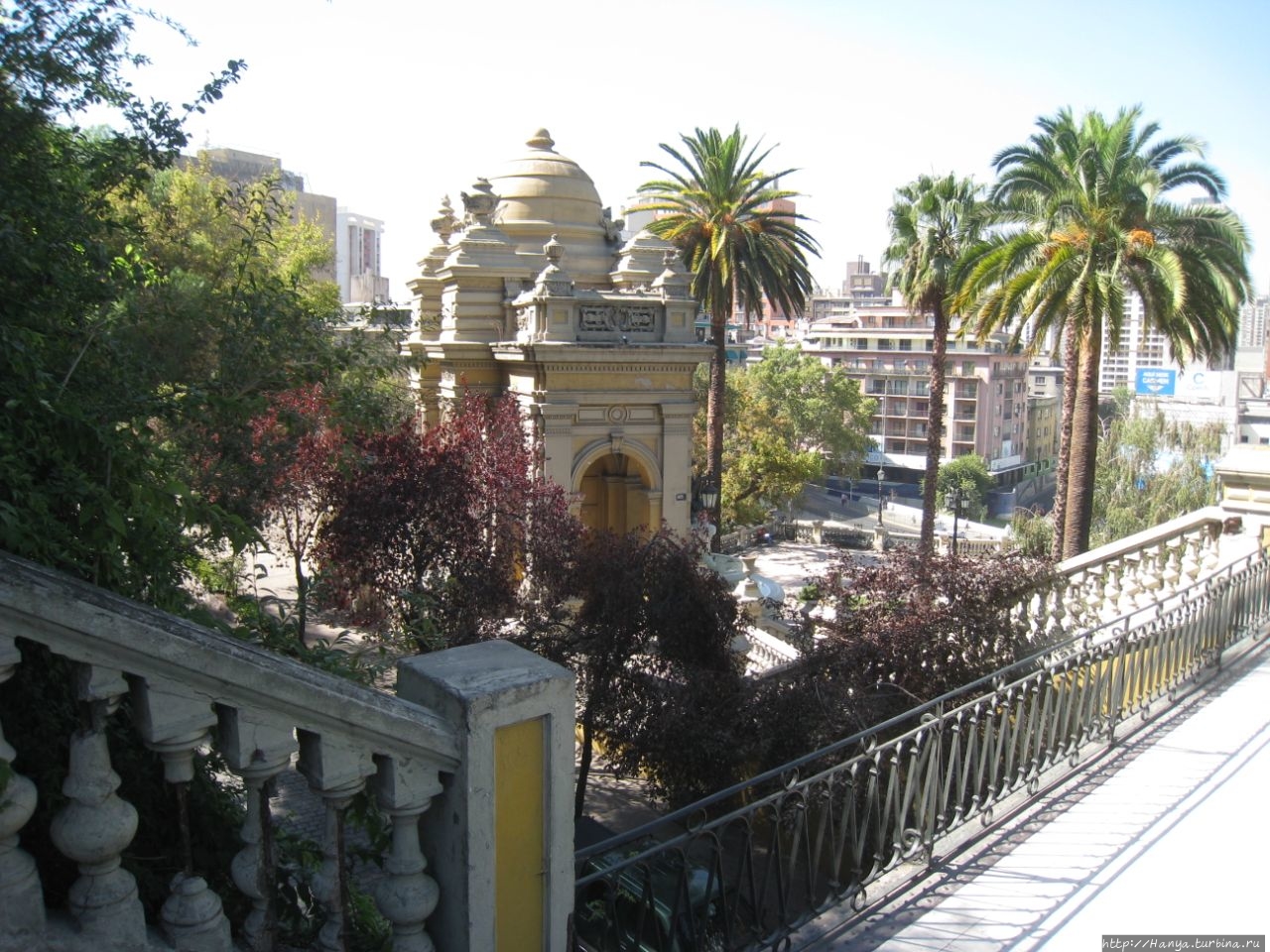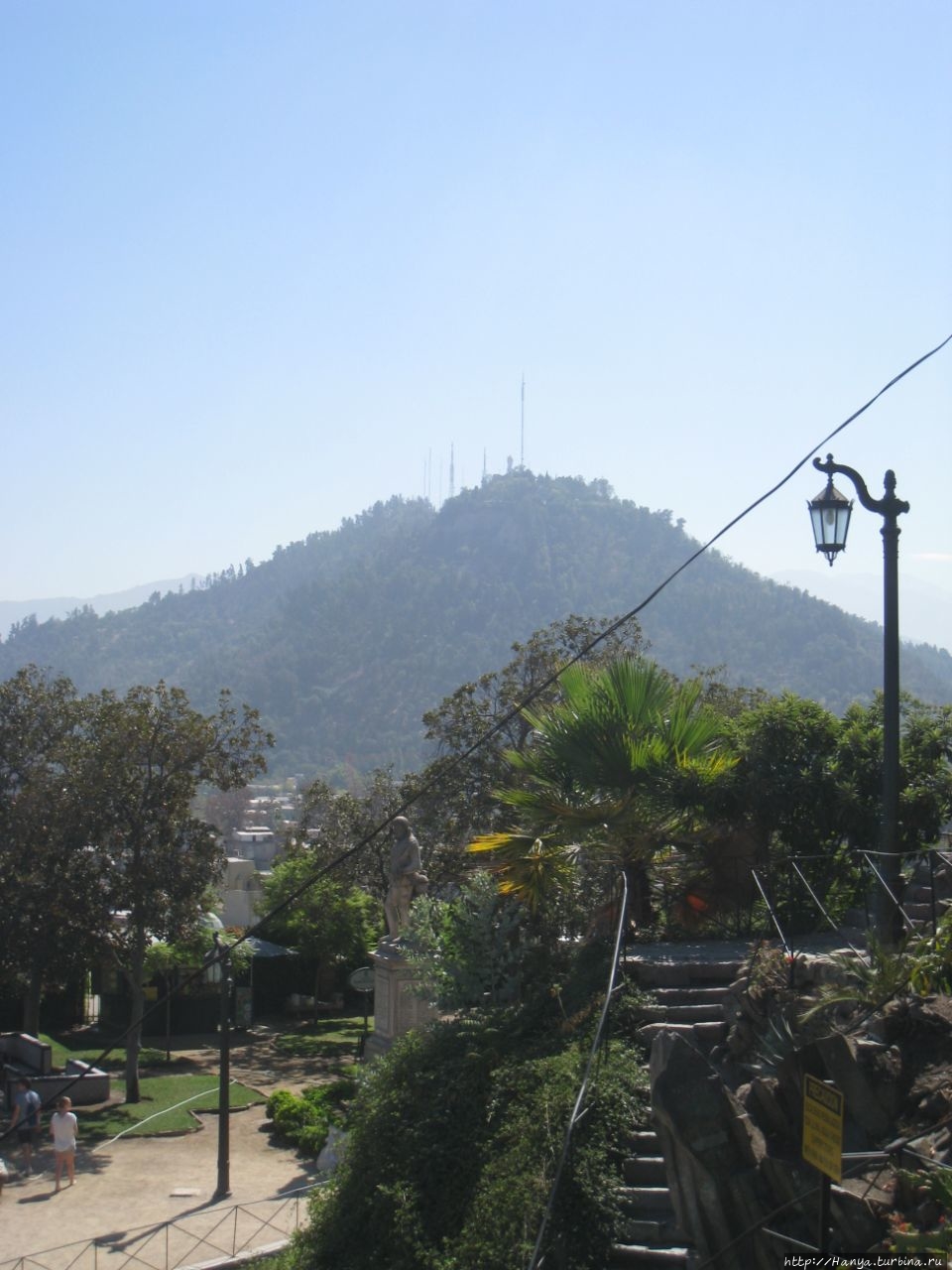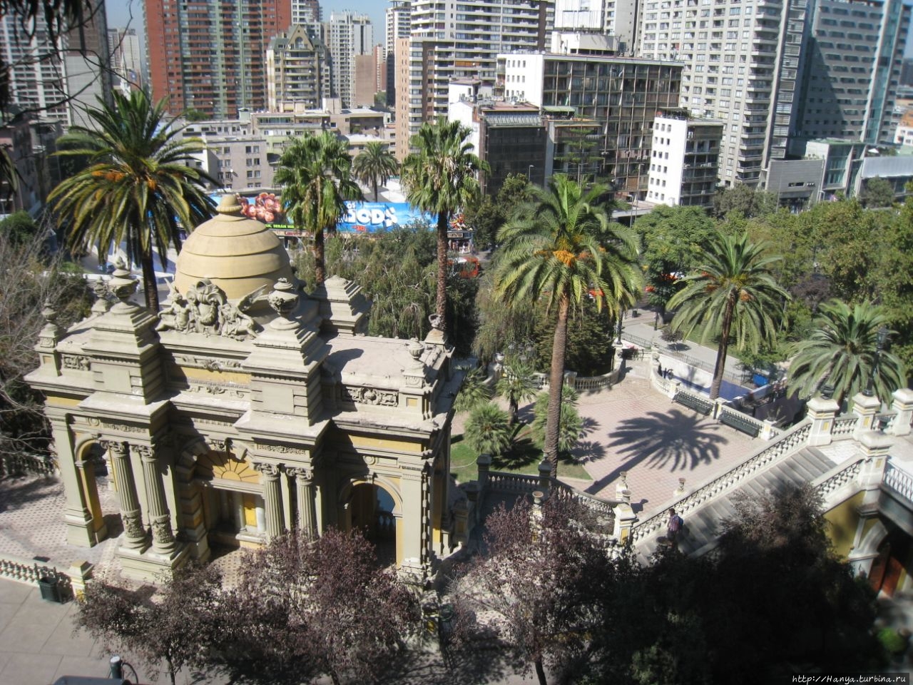 Дева Мария – ангел-хранитель Сантьяго и вид на столицу. Ч.5).Спускаемся вниз по боковой лестнице и попадаем на площадь Педро де Вальдивия, где садимся на красивые скамейки, покрытые бело-синими изразцами.