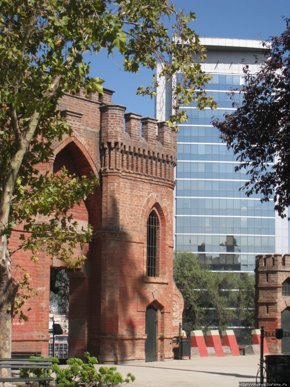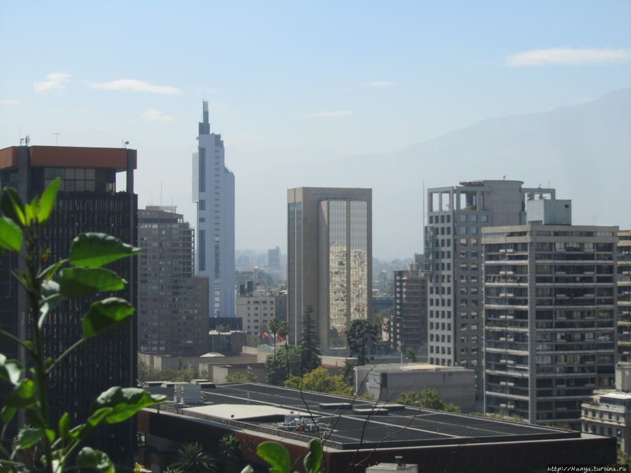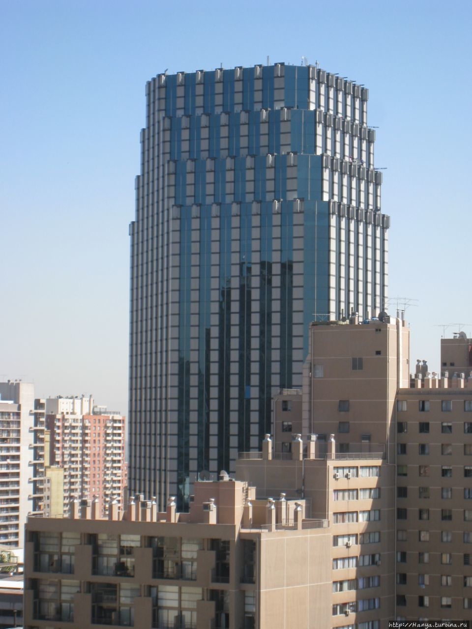 Еще одно фото демонстрирует министерство обороны Чили (тёмно-коричневое здание слева и чуть сзади) и Башню испанского телекоммуникационного альянса Telefonica 1996 года постройки (142 метра, 33 этажа). Эта Башня была самым высоким небоскребом Сантьяго вплоть до 2009 года. Примечательно, что в основе архитектурной композиции башни Torre Telefónica Chile положена конструкция мобильника тех лет.