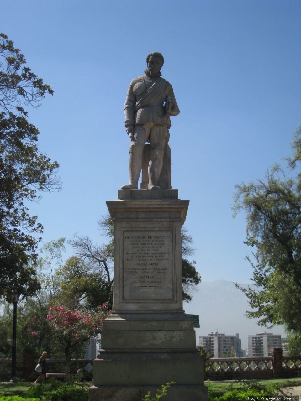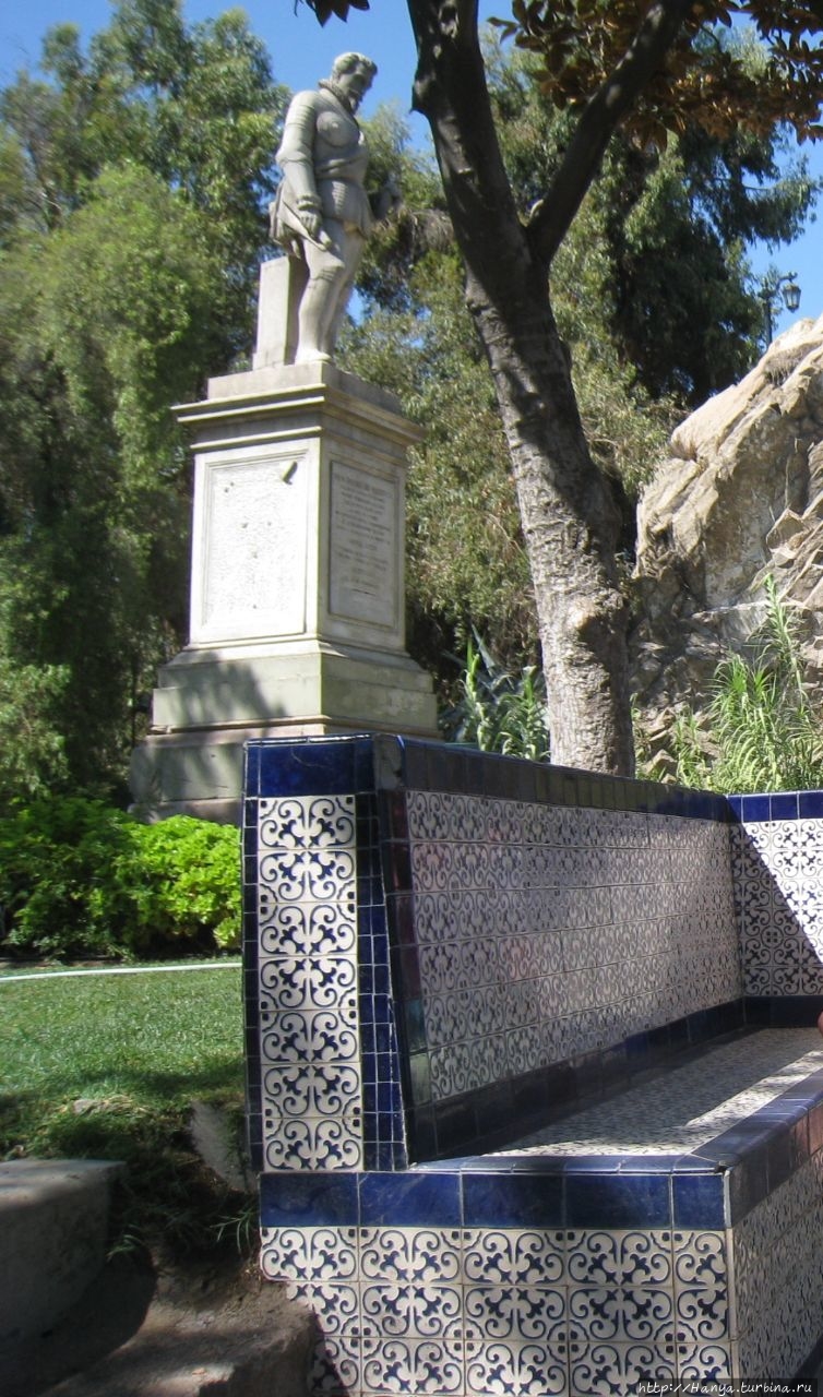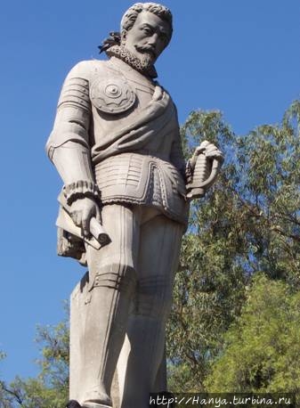 Пласа де Армас. Памятник основателю города де Вальдивия. Ч.7). Там – это, действительно герой, здесь же совсем другое дело. В правой руке он держит свиток (возможно, план города), голова не покрыта, но главное – это его поза с согнутой ногой, что намекает на его усталость и желание отдохнуть.Как правило, герои-завоеватели не оставляли своих портретов, так случилось и с Вальдивией, поэтому никто не знал, как он выглядел и каким был. Это касается не только черт лица, но и одежды. Интересно, что поскольку Вальдивия был родом из испанской Эстрамадуры, то сработал штамп, и на многих портретах, как и у этой статуи, у него имеется пышный накрахмаленный воротничок, или жабо. И все бы ничего, но чтобы такой воротник вынуждал его владельца держать прямую осанку, его нужно было крахмалить, что было исключено во время военных действий и завоеваний. К слову сказать, такое жабо было более свойственно для придворных, которые, что называется, пороха не нюхали.