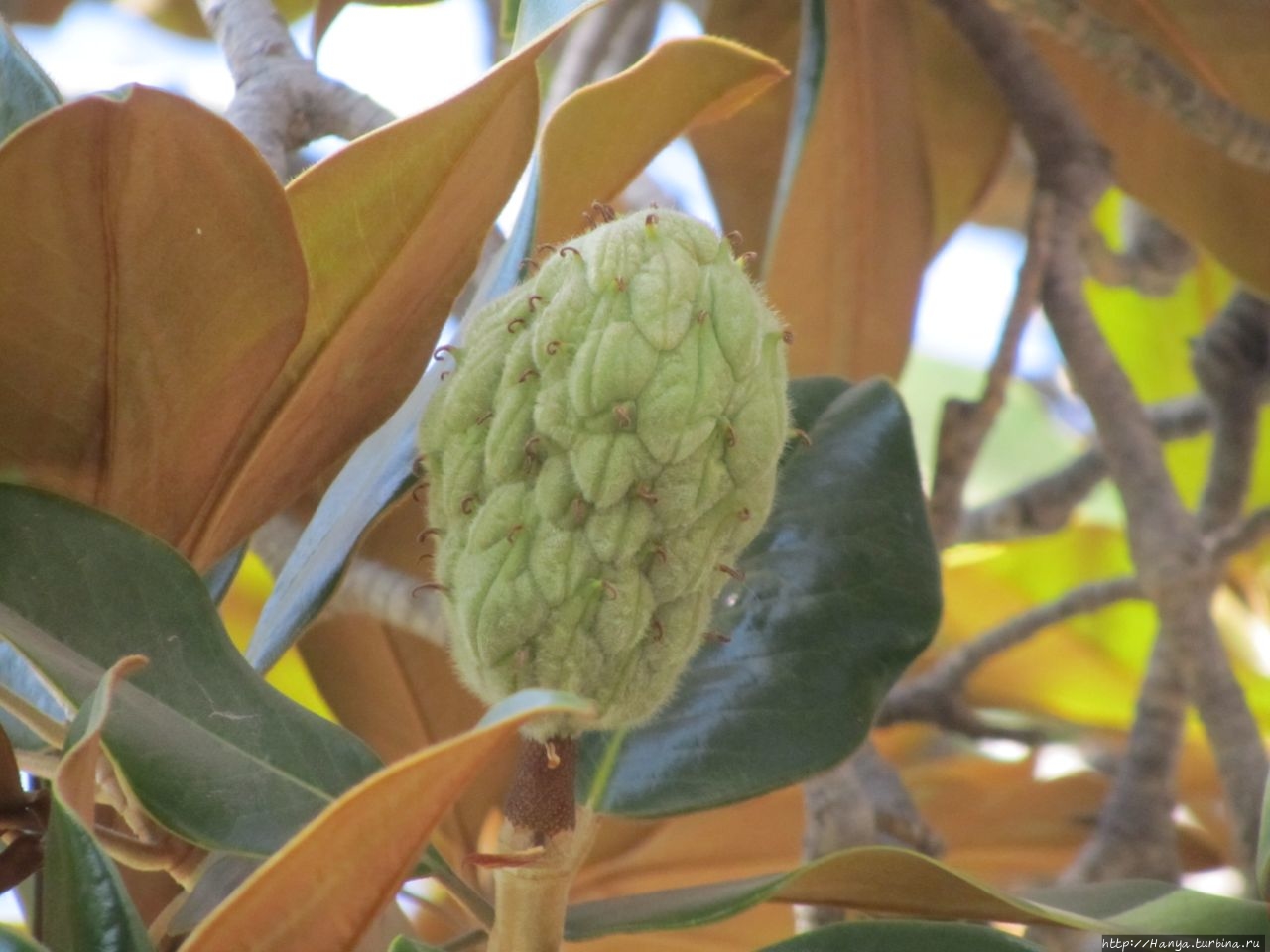 но мы не спешим к нему, а сидя, рассматриваем дерево магнолию, чья тень благотворна для нас в такую жару. Смотрим внимательно, может, остались еще цветки, но нет, уже только характерные шишки.