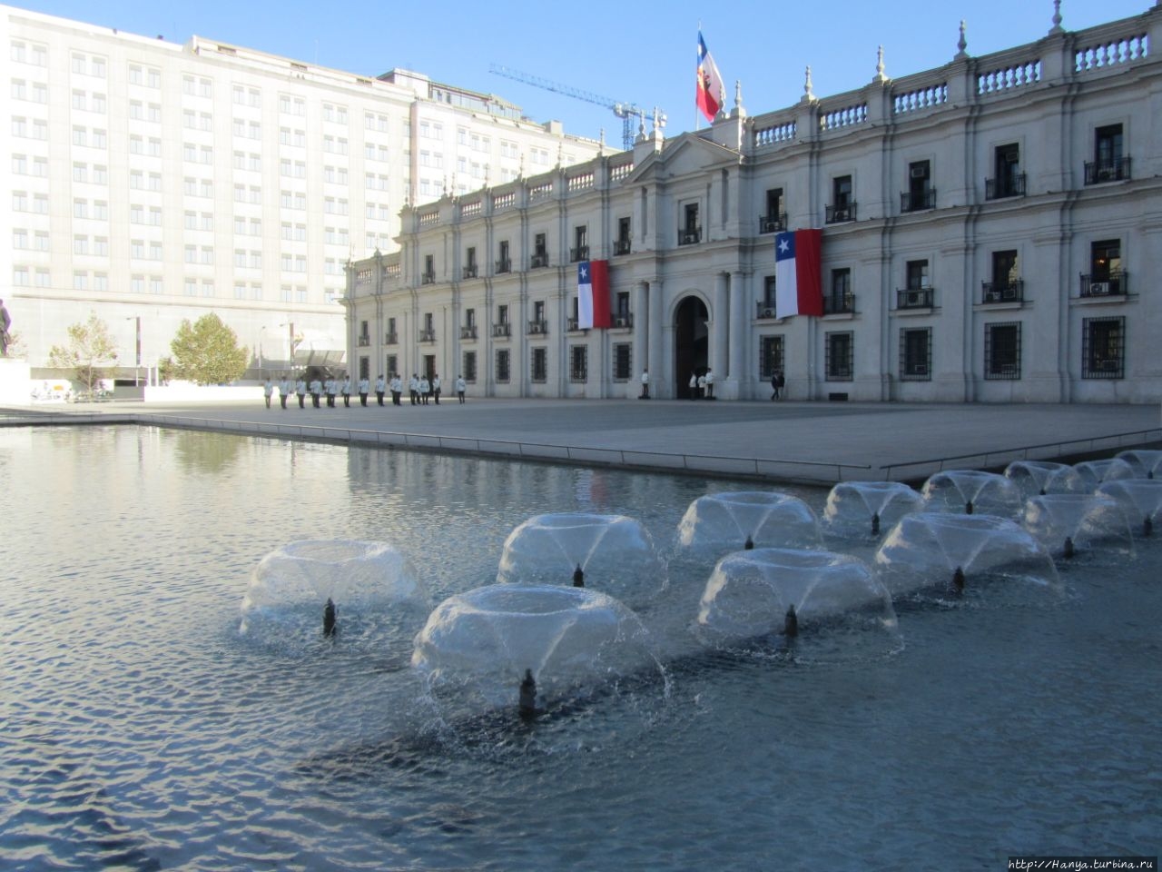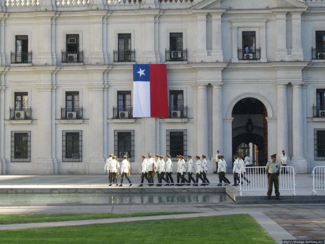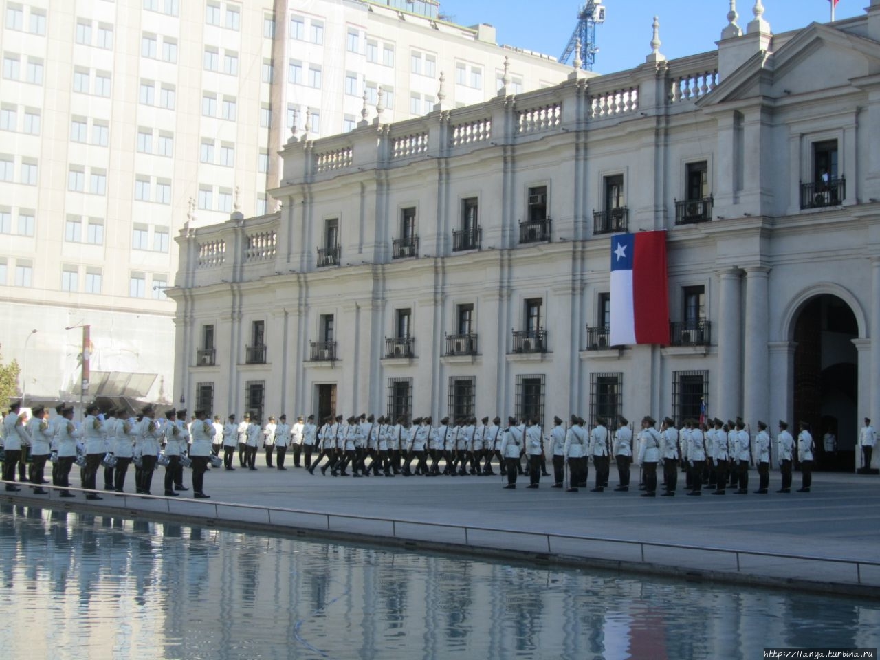 Чилийские мурали, русский мат и раскрепощенность горожан.Ч98), мы отправились к Президентскому дворцу Ла Монеда, чтобы поприсутствовать на церемонии смены караула, происходящей по четным дням в 10.00. .