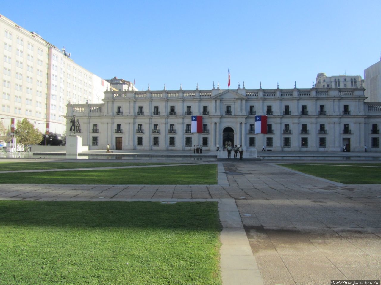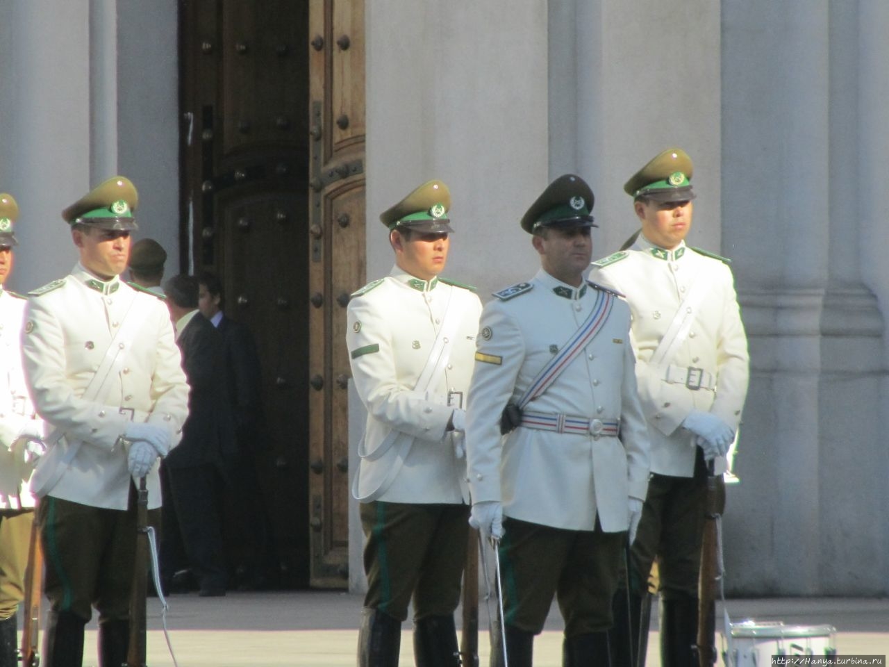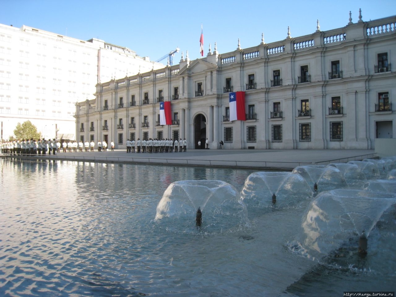 Чилийские мурали, русский мат и раскрепощенность горожан.Ч98), мы отправились к Президентскому дворцу Ла Монеда, чтобы поприсутствовать на церемонии смены караула, происходящей по четным дням в 10.00. .