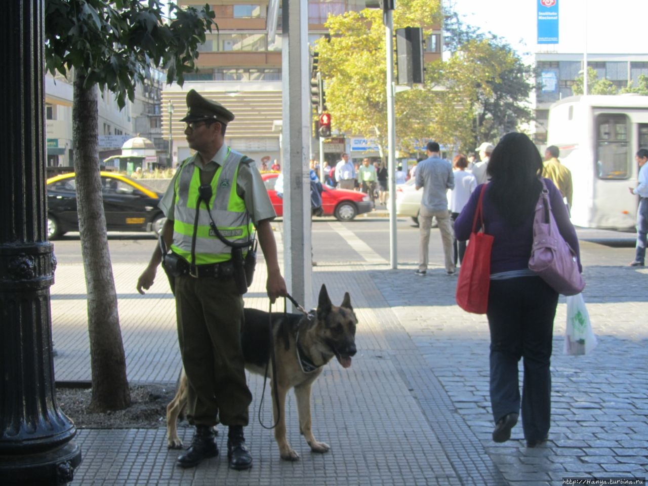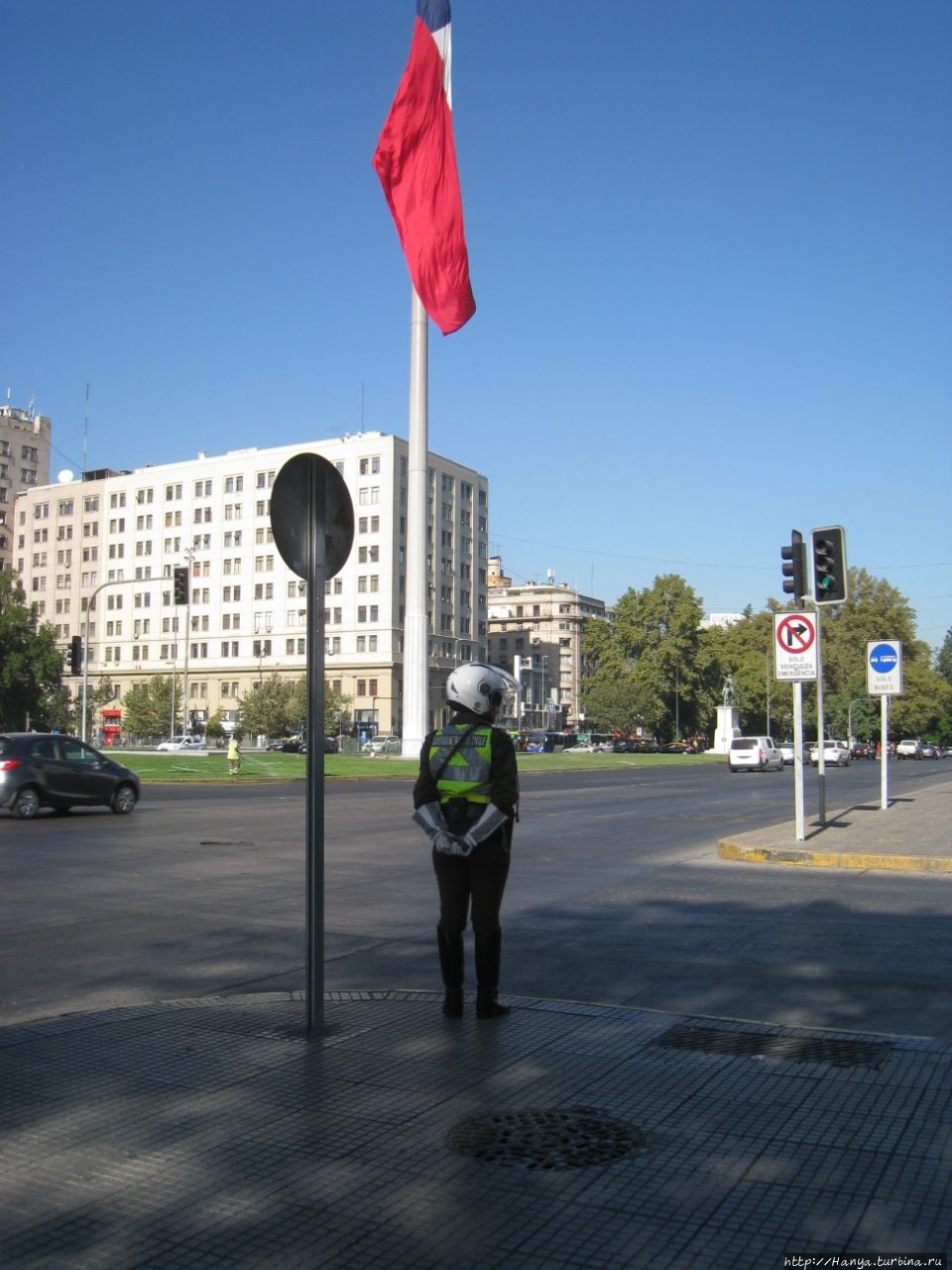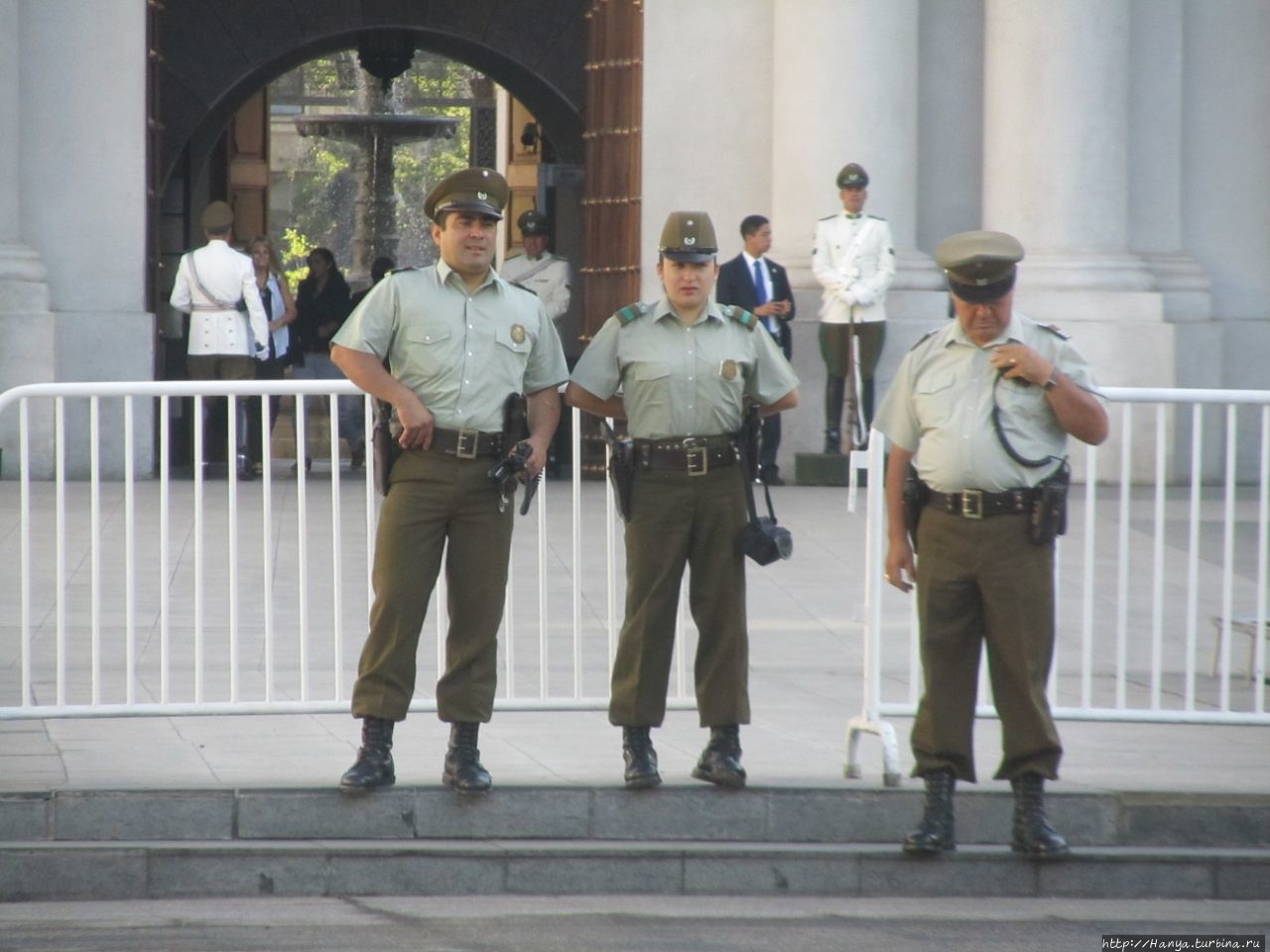 На углу О’Хиггинса стоит карабинерка в полной амуниции, и не теряет терпения, одинаково любезно отвечая всем туристам, как пройти, проехать и что делать. За все время своего пребывания в столице, мы так и не поняли, постоянно ли это патрулирование карабинерами улиц Сантьяго, или вызвано каким-то мероприятием.