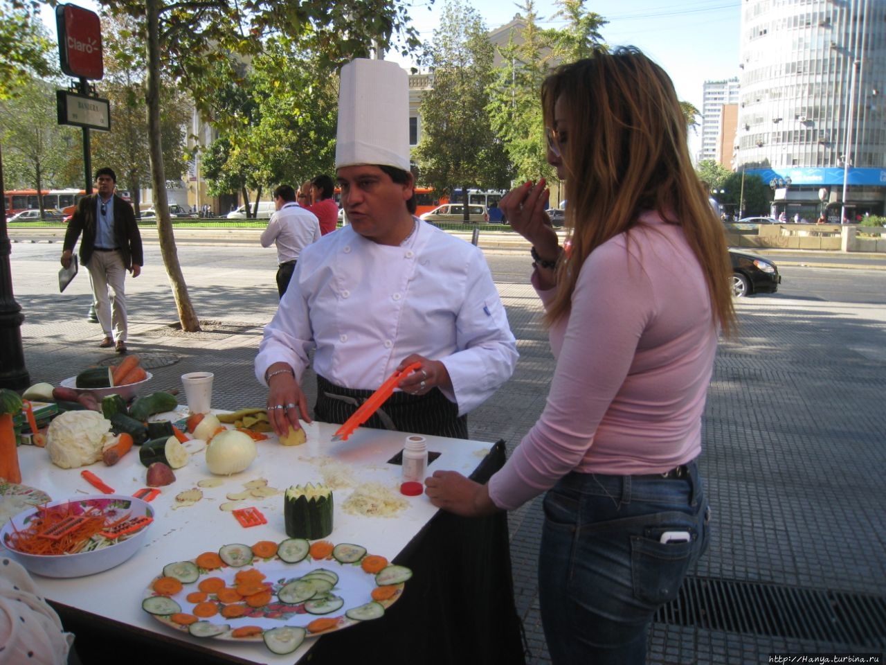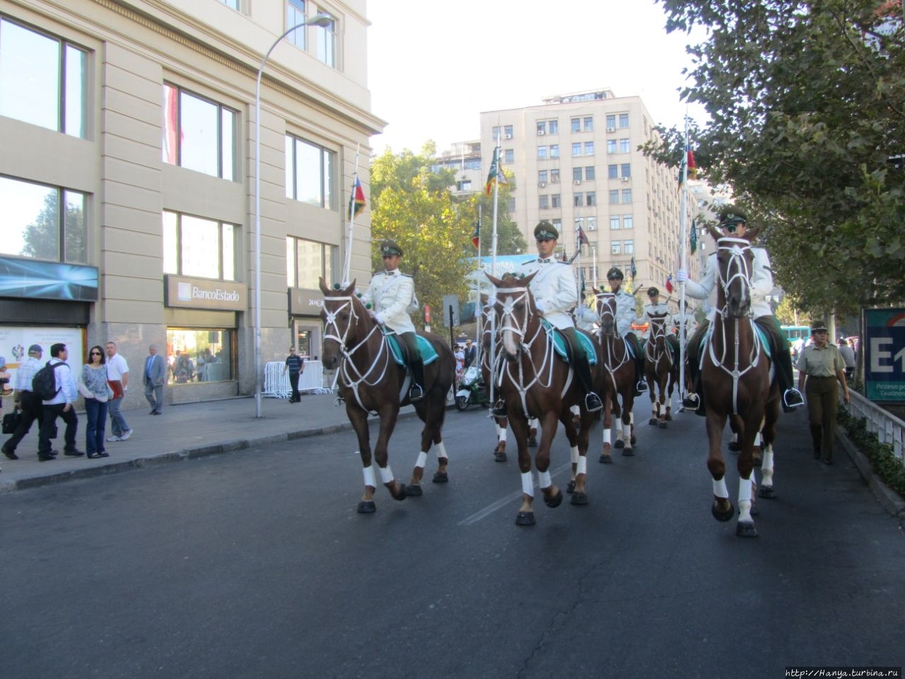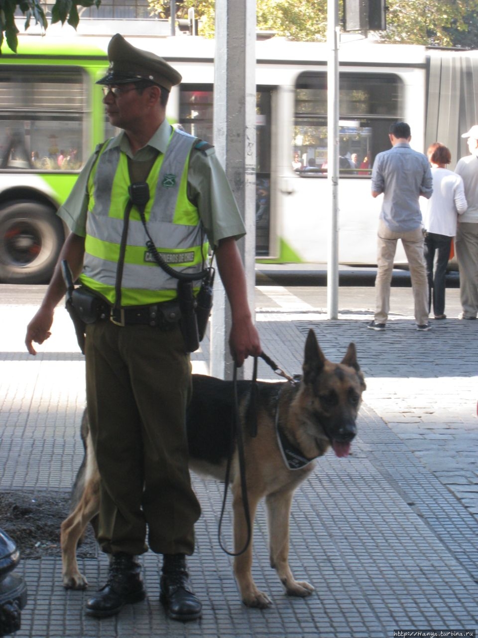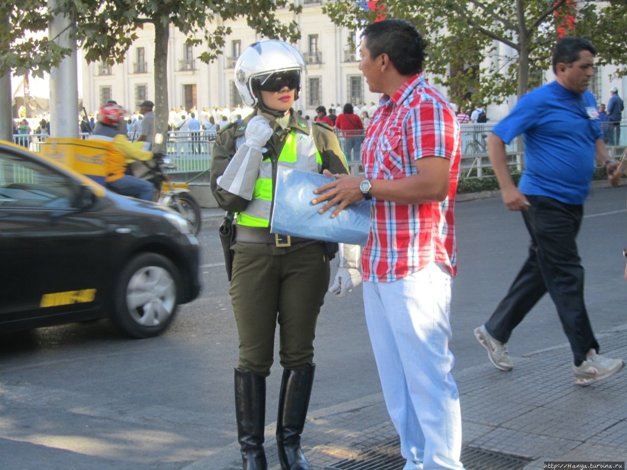 На углу О’Хиггинса стоит карабинерка в полной амуниции, и не теряет терпения, одинаково любезно отвечая всем туристам, как пройти, проехать и что делать. За все время своего пребывания в столице, мы так и не поняли, постоянно ли это патрулирование карабинерами улиц Сантьяго, или вызвано каким-то мероприятием.