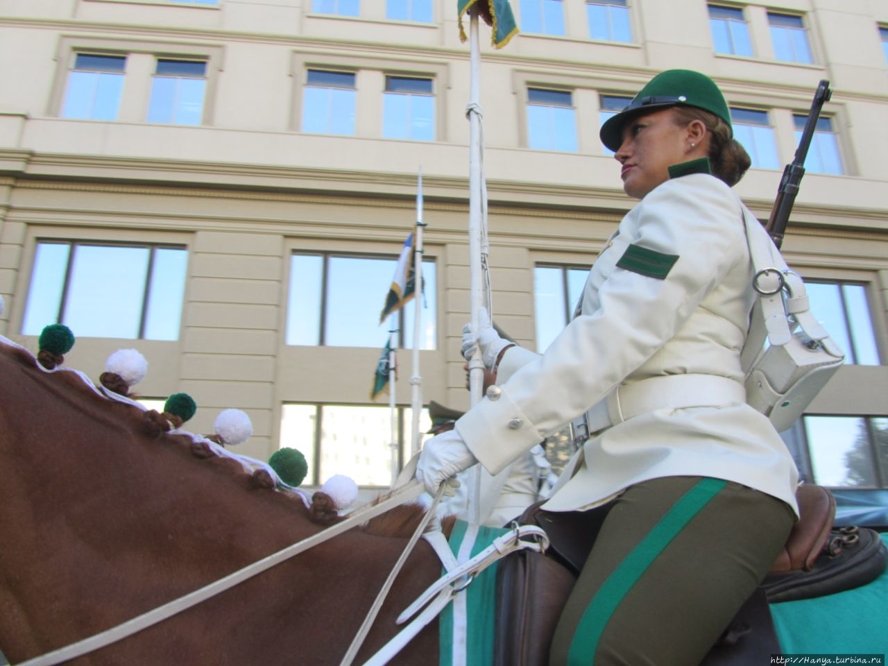 Затем следовали трубачи, барабанщики и конница, среди всадников тоже были женщины. В белых кителях и блестящих сапогах все участники выглядели парадно и торжественно, в это же время вдоль самого дворца происходило не менее захватывающее действие: построение, принятие доклада и собственно смена караула.