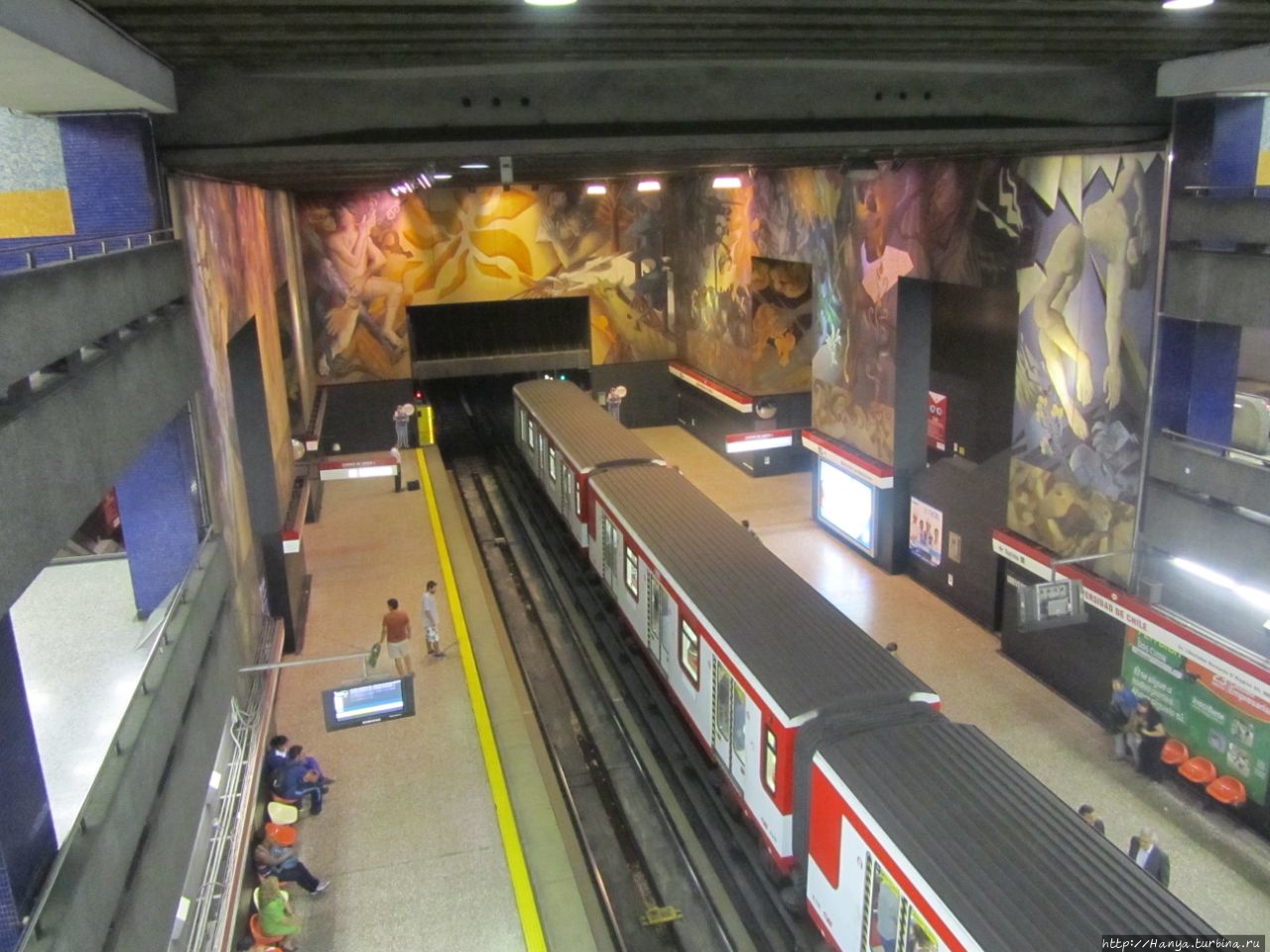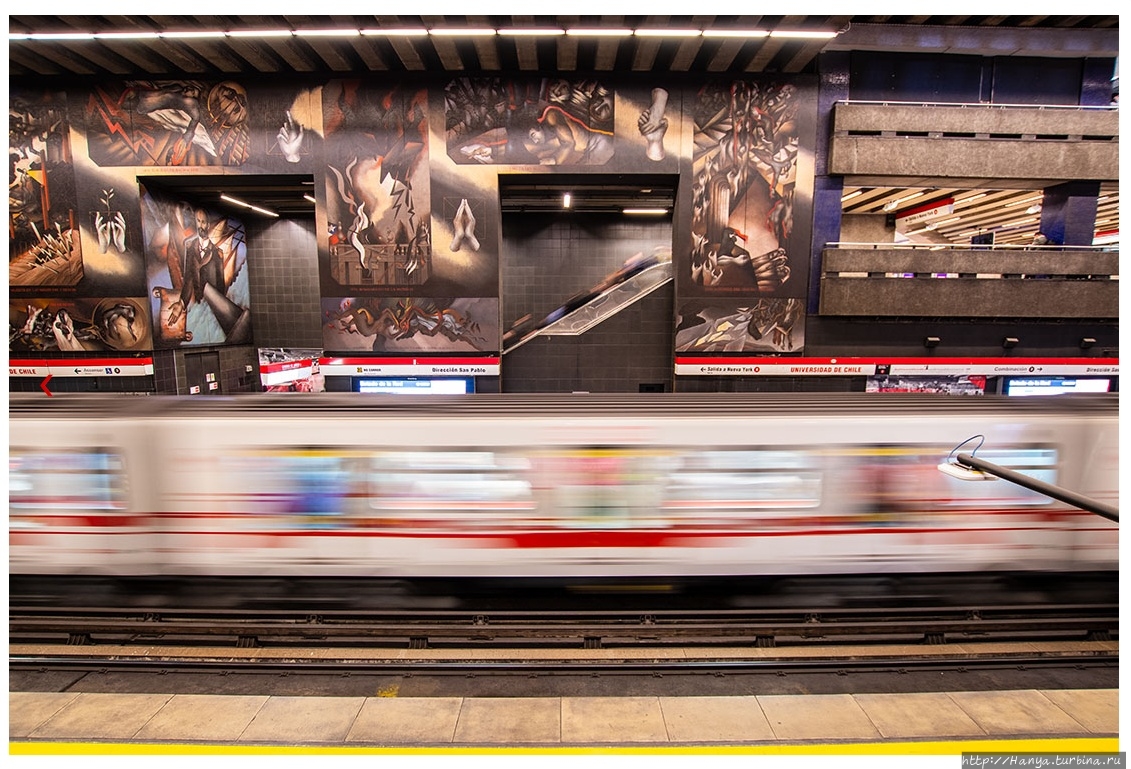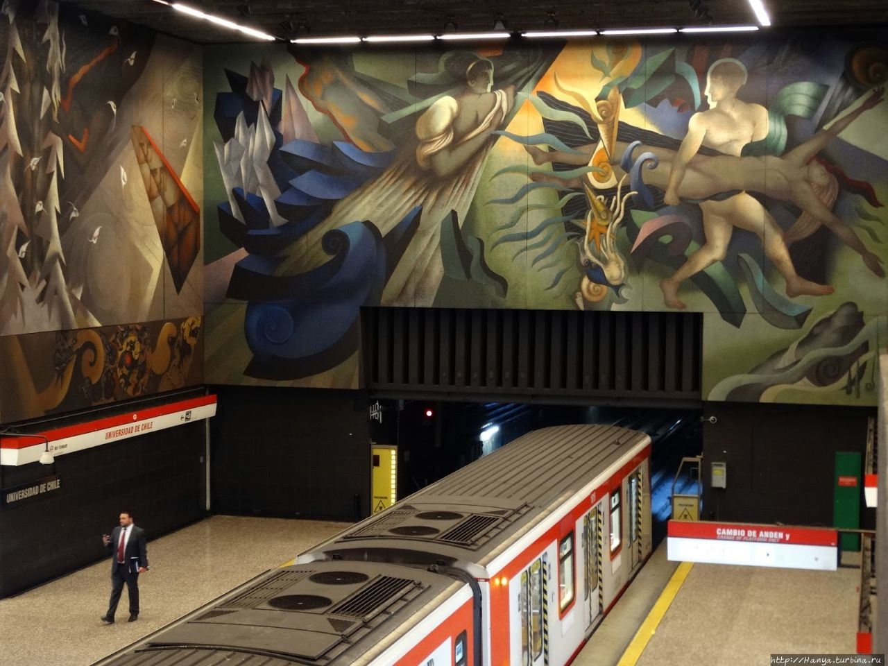 Считается, что эта станция, к слову сказать, расположенная не просто под землей, а непосредственно под зданием Университета, в котором преподавал нобелевский лауреат Пабло Неруда, самая живописная. И это так, потому что то, что мы увидели вчера, нас сильно потрясло. Здесь так сказать размещены мурали на тему «Визуальная память нации». Если подробнее, то это шесть фресок работы чилийского художника Марио Тораля, и они занимают (только вдумайтесь!) площадь в 1200 квадратных метров. Здесь нашли свое место и испанские конкистадоры, воины мапуче, Артуро Прат, Пабло Неруда, сцены из современной жизни страны и уж, конечно, не обошли они стороной изображение репрессий времен военной диктатуры Пиночета. Этот сплошной ковер картин, покрывающий стены, на самом деле создает ощущение погружения в историю страны.