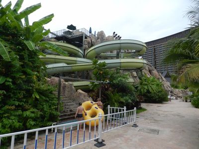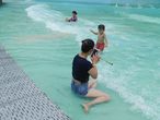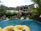 Про сам аквапарк буду краток. Таковой разделён на несколько зон. Но территорию он занимает, отнюдь, не большую. Кто был в подобных заведениях в Испании либо в ОАЭ, того Амазон наверняка разочарует. Аттракционов мало, вдобавок к этому часть водных горок в момент нашего визита ещё и не работала. Петля анаконды адреналина в крови конечно добавляет, но после третьего раза тащиться вверх по лестнице вместе с ватрушкой, вроде как уже и не хочется. Малыши визжат от удовольствия когда их обливает одна из водяных горок. Ещё, им особо нравится прыгать на искусственной волне. В принципе аттракцион хороший. Взрослым волна тоже нравится. И всё же в голове сверлит мысль, что мы то не в бассейн, а на море приехали....