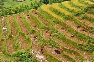 Рисовые террасы – это остроумное инженерное решение, придуманное древними жителями Азии. Для роста риса необходима вода в больших количествах. Каждая терраса – это своего рода бассейн, который удерживает воду, выходящую из грунта и обильно выпадающую на местные склоны в виде осадков. Вода стекает на террасы и из лесов, укрывающих вершины горных хребов, что гарантирует обилие воды и перспективу хорошего урожая.