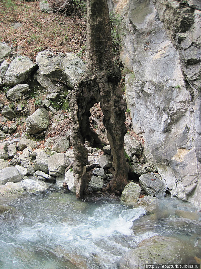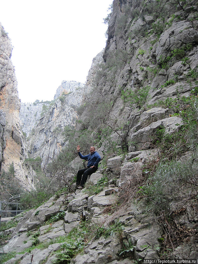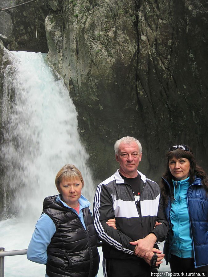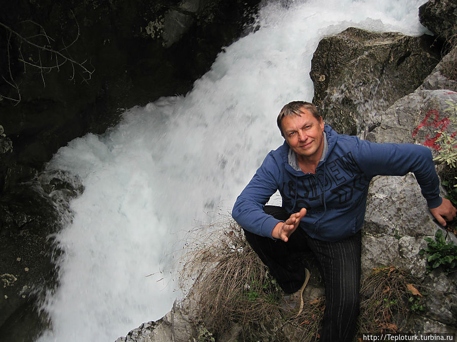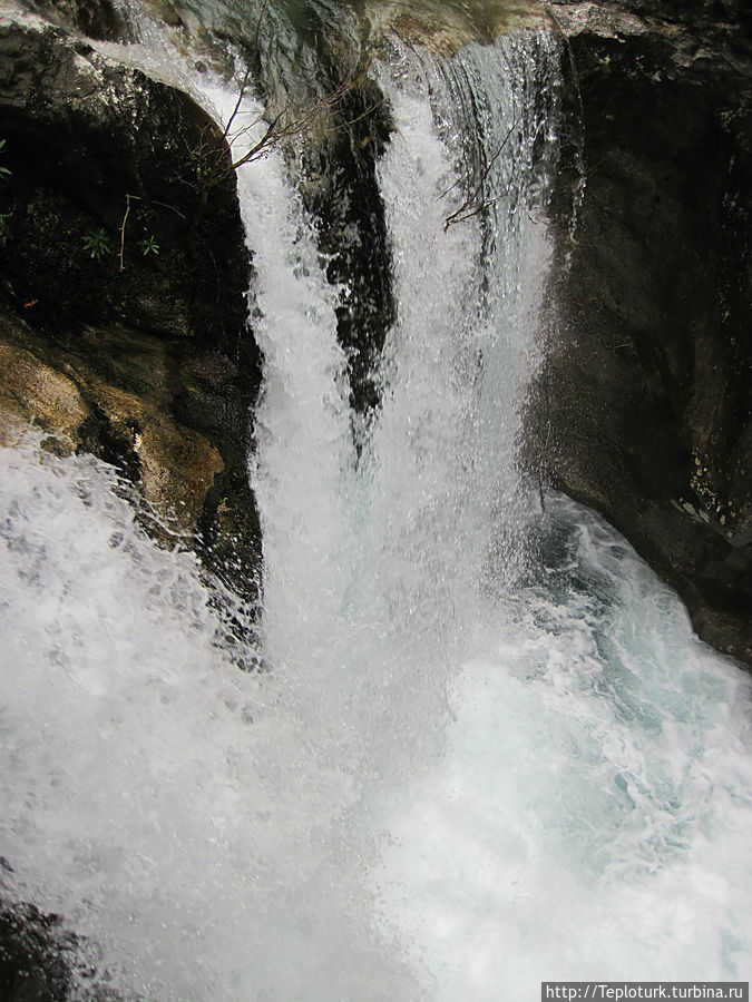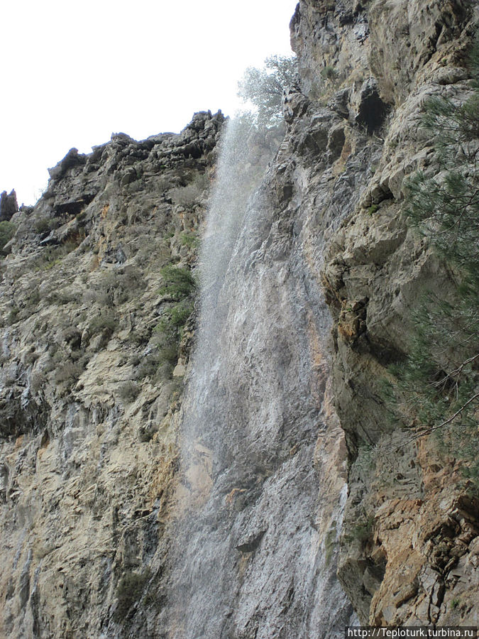 Посетителей не много – туристический сезон закончился. Любоваться красотами идут в основном турецкие семьи. Через 400 метров достигаем конечной площадки у основного водопада. Грохот, водяная пыль и надпись «Нырять запрещено». Кому придет в голову биться о камни в этом потоке?