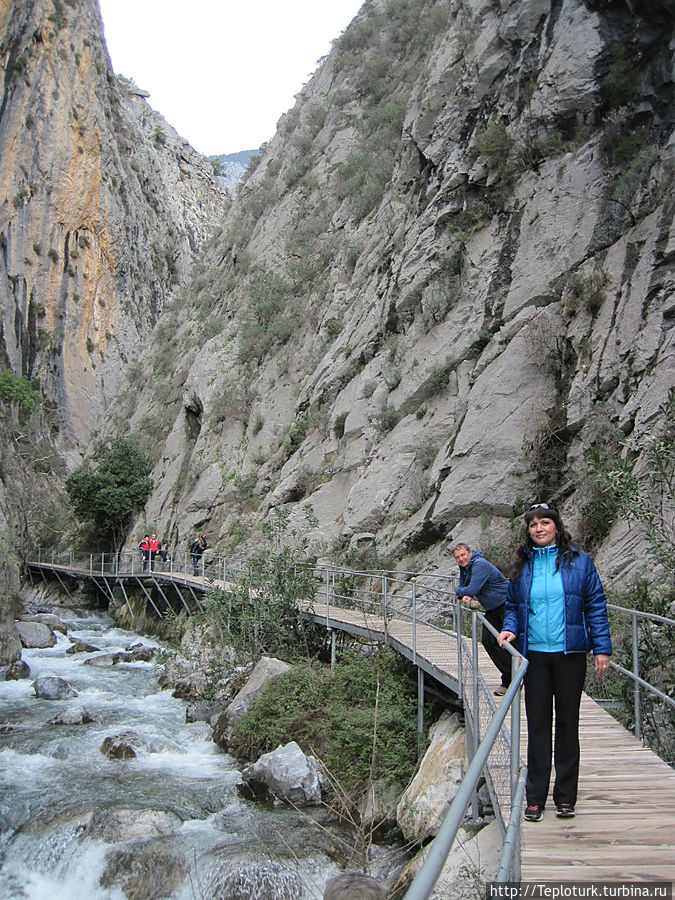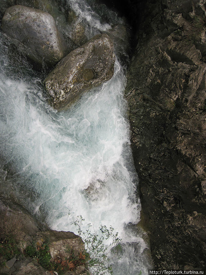 Деревянный настил дорожки петляет среди сужающихся стен каньона. Поток воды становится все сильнее. Вид бурлящей воды внушает уважение к силе природы. Слева, с высоты 50-70 метров падает узкая струя воды, рассыпаясь по скале мелким бисером – это один из притоков основного русла.