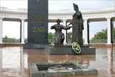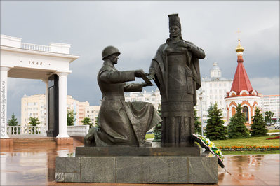 15. Скульптурная группа крупным планом. Справа видна часовня Александра Невского, построенная в 2000 году. Она задаёт западную границу площади Победы.