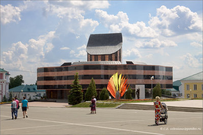 Пройдя мимо дореволюционного здания, мы плавно переместились на другую площадь – площадь Победы. В то же время это по-прежнему Советская улица. На площади находится мемориальный комплекс, посвящённый Великой Отечественной войне. Центральная часть комплекса — дугообразная галерея длиной 54 метра с двумя рядами колонн, между которыми расположены 10 пилонов, облицованных чёрным полированным камнем, с именами воинов из Саранска, погибших в годы Великой Отечественной войны. Перед галереей стоит 18-метровый гранитный пилон, на котором написано: "Вечная слава воинам, павшим в боях за свободу и независимость Советской Родины в Великой Отечественной войне 1941-1945. Вы ушли из жизни, чтобы спасти жизнь. Подвиг ваш, имена ваши навеки в сердцах благодарного народа". 14. Подойдя ближе, увидим перед пилоном Вечный огонь и скульптурную группу из двух фигур с символически-аллегорическим значением: женщина в национальной одежде, олицетворяющая мать-Мордовию, вручает меч сыну-солдату, благословляя его идти на войну. Памятник открыт 9 мая 1970 года.