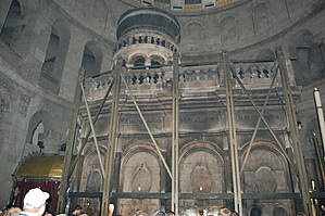 Место воскресения Христа. Часовня Гроба Господня. Видны скрепляющие часовню стяжки. Они были сделаны после землетрясения 1927 года.