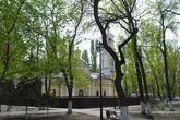 было кафе и тогда он работал. Сквозь ветви виден строящийся храм,