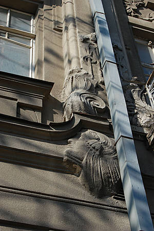 так и женских. Оригинально сделаланы лики усачей, из усов которых вырастает каменный узор вокруг лица.Мило выглядит особнячок на улице Дзержинского, 39. Расположен он недалеко от Крытого рынка и на нём несколько загадочных женских лиц с закрытыми глазами.