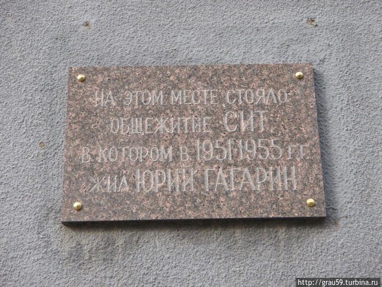 О том, что здесь в комнате №9 жил Ю.А.Гагарин напоминает только мемориальная табличка. Интересный казус , а может байка — якобы, несмотря на строгие правила прописки в СССР, Гагарина не выписали из общежития после окончания техникума. Выяснилось это лишь после полёта Юрия в космос и комендант заявил, что теперь смысла нет выписывать.