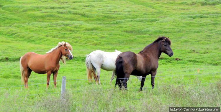Дорога шла среди невысоких гор и редких ферм, возле которых паслись овцы и низкорослые исландские лошади. Увидев несколько лошадей, пасущихся прямо у дороги, сделали остановку для фотосессии – уж очень всем понравилась одна лошадь с шикарной бело-рыжей гривой. Ну, прямо настоящий парень-скандинав!
