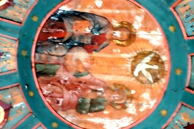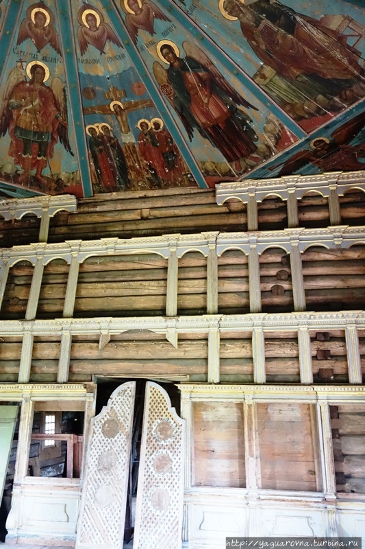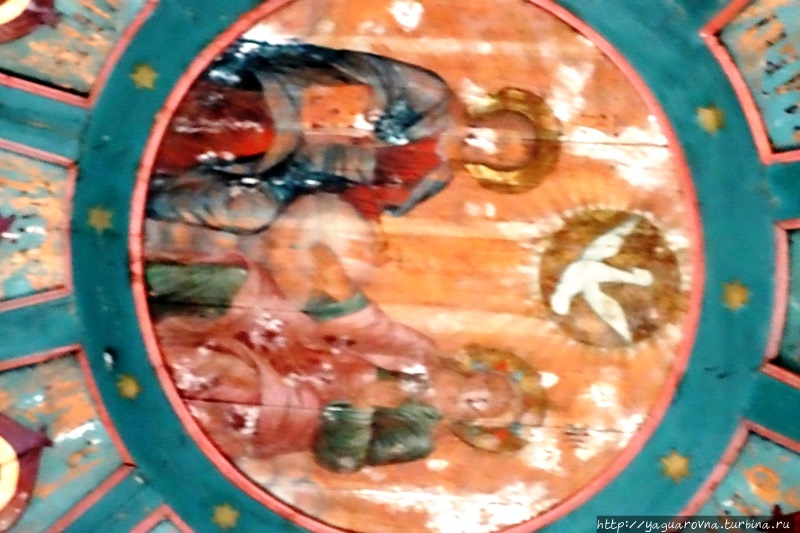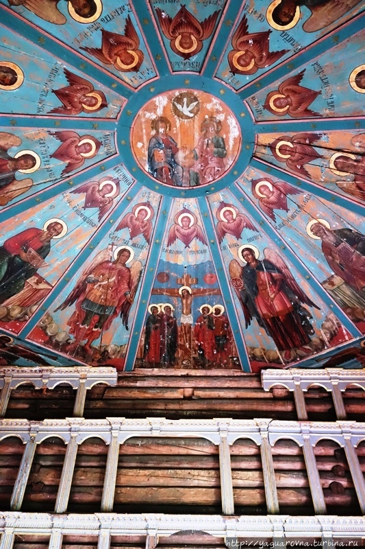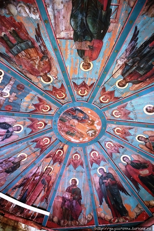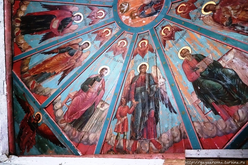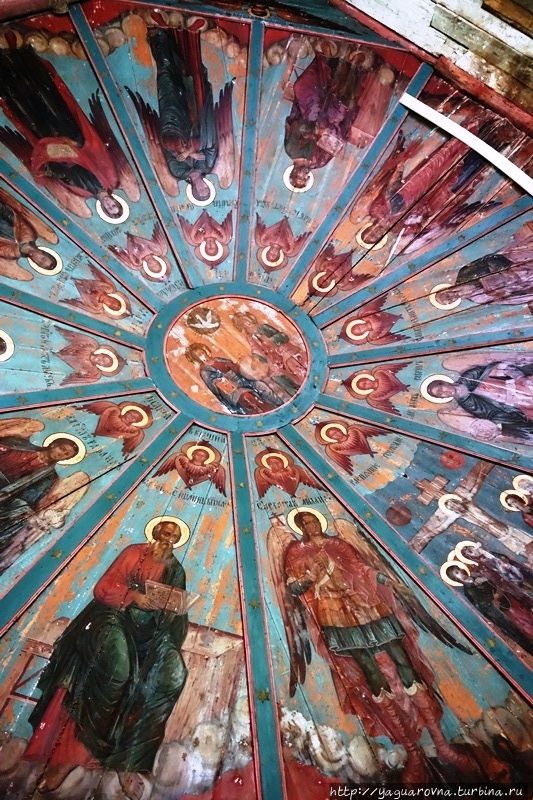 Конечно, их объем впечатляет нас, москвичей, редко попадающих в настоящий северный лес. Но самая "соль" этой церкви не они. В церкви прекрасно сохранились расписные двенадцатигранные "небеса" с евангелистами и архангелами в полный, точнее, человеческий рост.