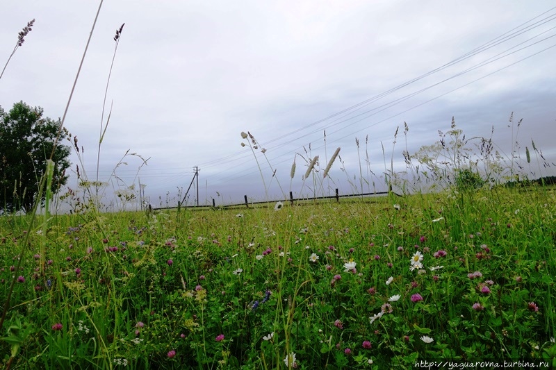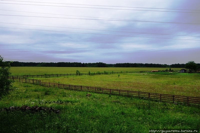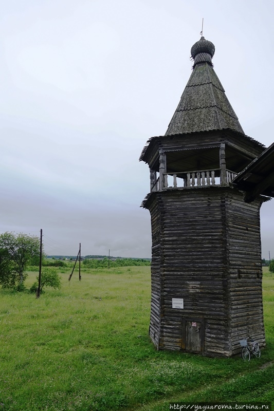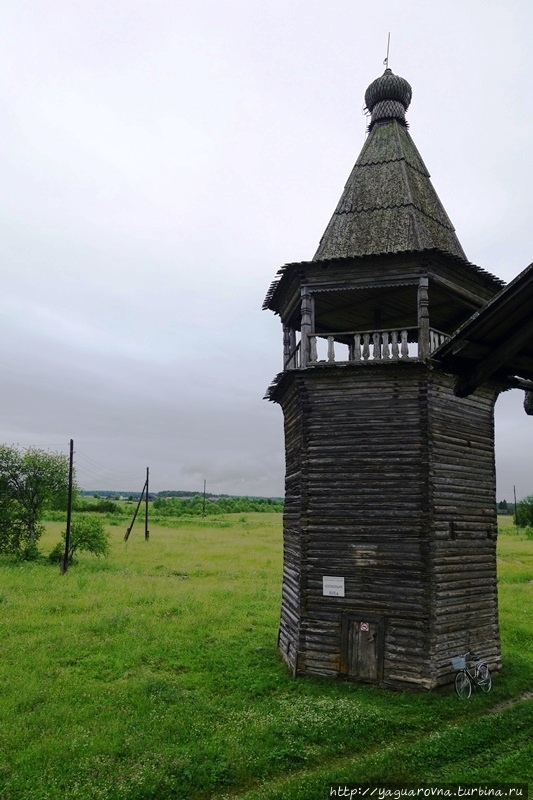 Может быть потому, что были мы здесь в дождливую погоду, в первую очередь испугалась я, что в стоящую на открытом месте церковь может ударить молния, и иссохшееся за века деревянное строение исчезнет навсегда. Из всех средств предотвращения пожара увидела табличку "не курить" на колокольне... Говорят, что громоотволы есть, но я не заметила. Хочется верить, что жители Саунино, что спряталось в кустах за водоемчиком, смогут вызвать подмогу и сами до приезда спасателей организуют тушение пожара.