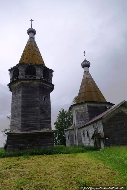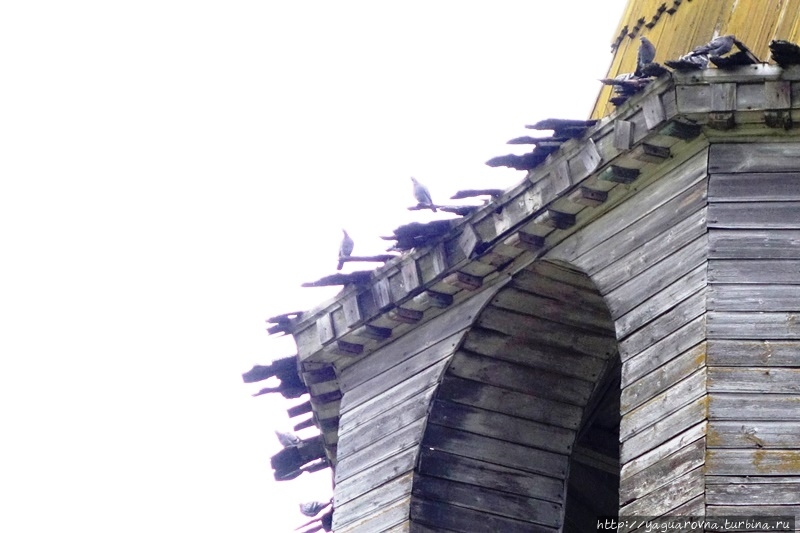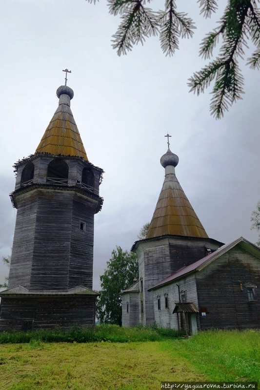 Деревянная "бахрома" на скатах крыши и ярусах церкви и колокольни — практически единственное внешнее украшение строений.