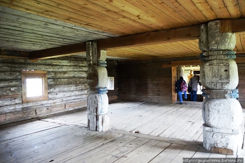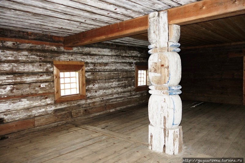 Потолочные доски лежат на мощном поперечном брусе – матице, а сама матица поддерживается двумя толстенными столбами. Столбы резные – в виде трех поставленных друг на друга "дынек" (скорее, тыковок), разделенных поясками в виде жгута.