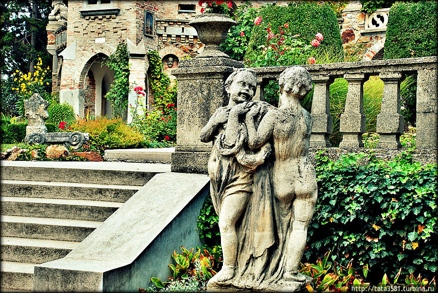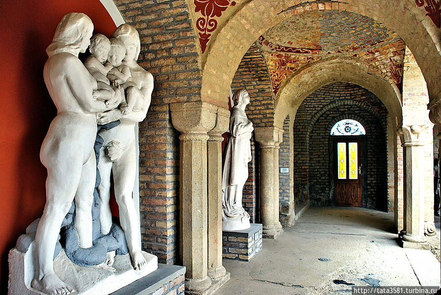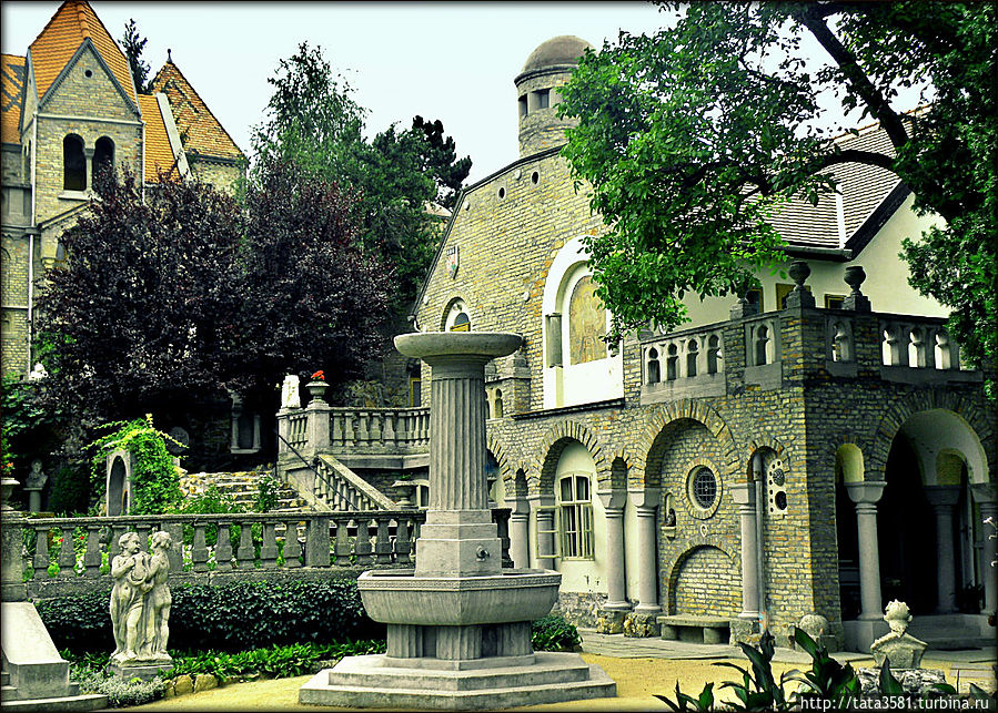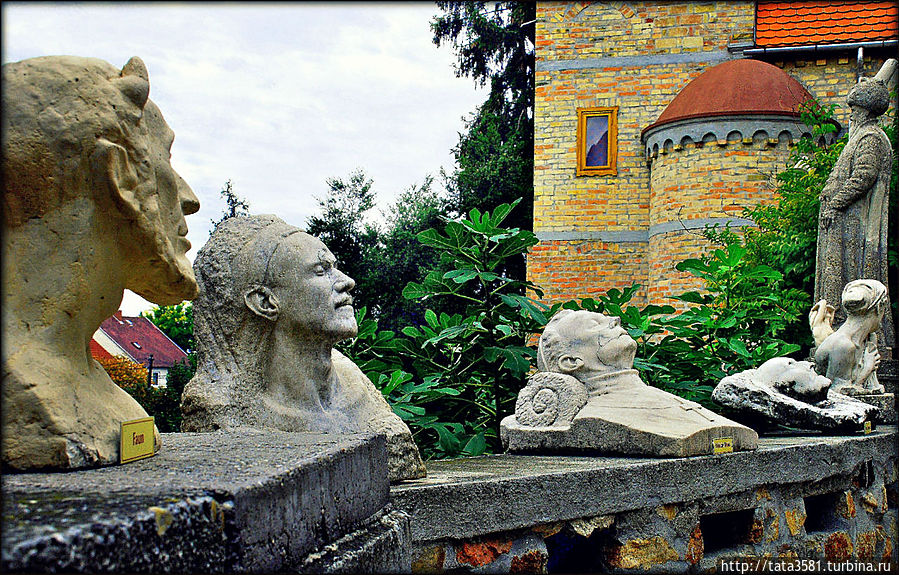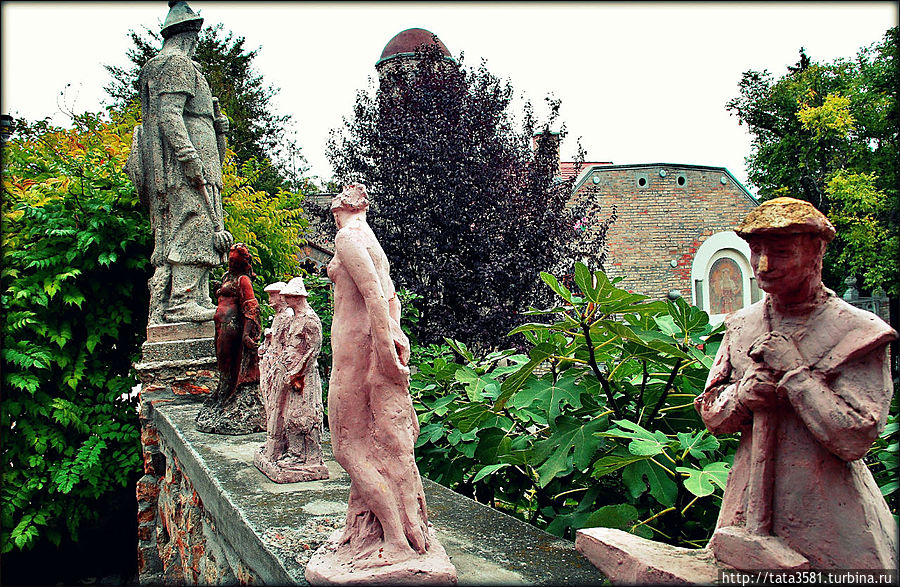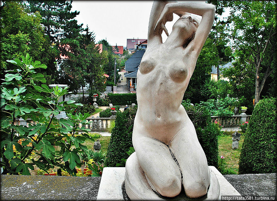 В саду находится огромное количество разных скульптур, есть даже памятник советскому солдату, корректировавшему артиллерийскую стрельбу с одной из башен замка и павшему за освобождение чужой земли. На террасах замка бюсты известных венгерских архитекторов, живописцев и скульпторов.