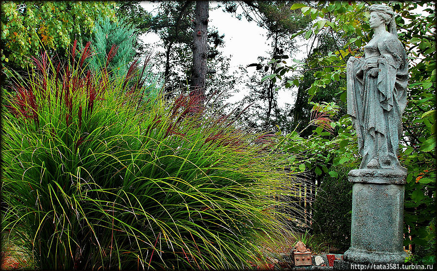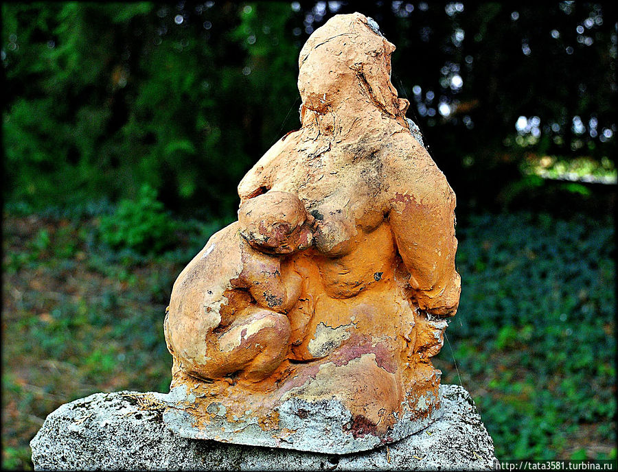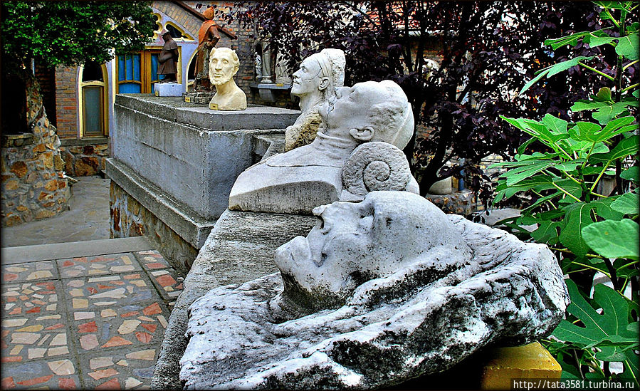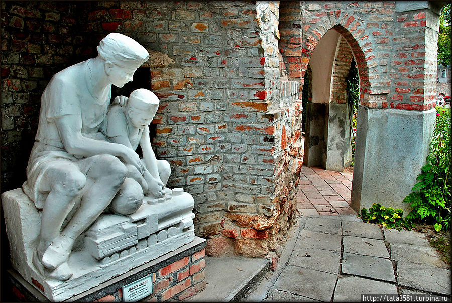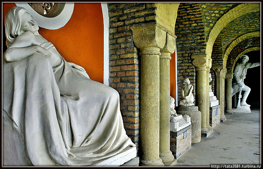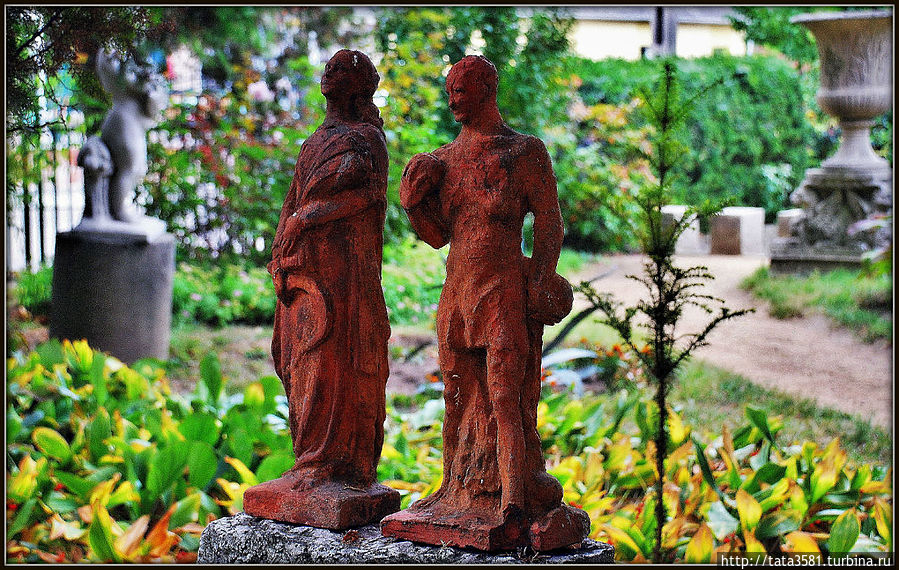 В саду находится огромное количество разных скульптур, есть даже памятник советскому солдату, корректировавшему артиллерийскую стрельбу с одной из башен замка и павшему за освобождение чужой земли. На террасах замка бюсты известных венгерских архитекторов, живописцев и скульпторов.