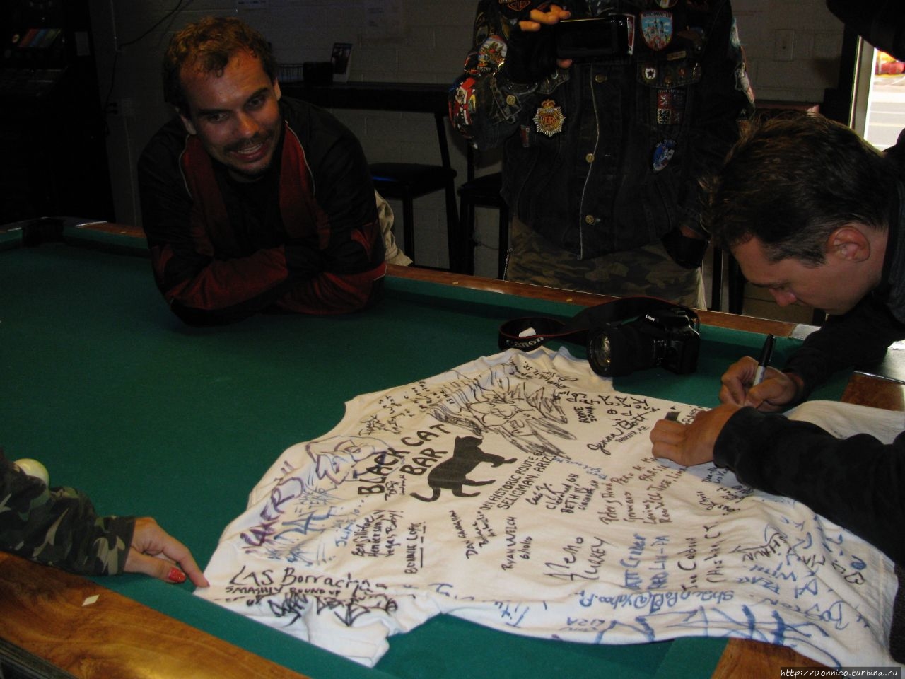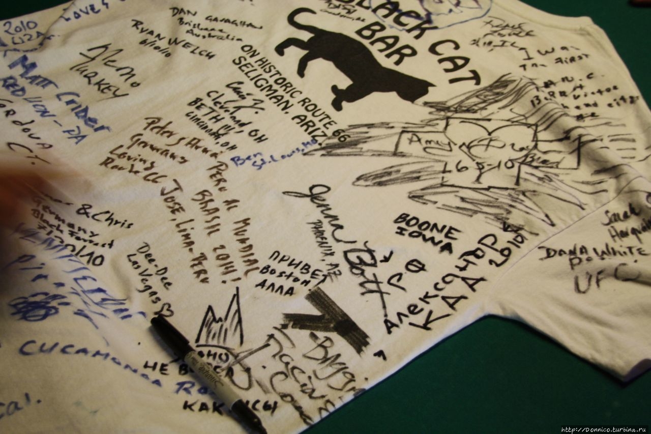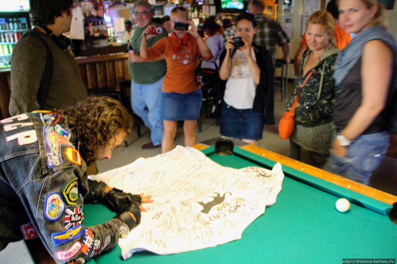 У меня с черными кошками весьма неплохие отношения, да и место было очень атмосферным. Нам дали майку, чтобы мы оставили свои автографы, а веселый бармен по имени Бостон, сказал, что уже очень давно никто из России к нему не заезжал, а тут сразу такая большая компания байкеров.