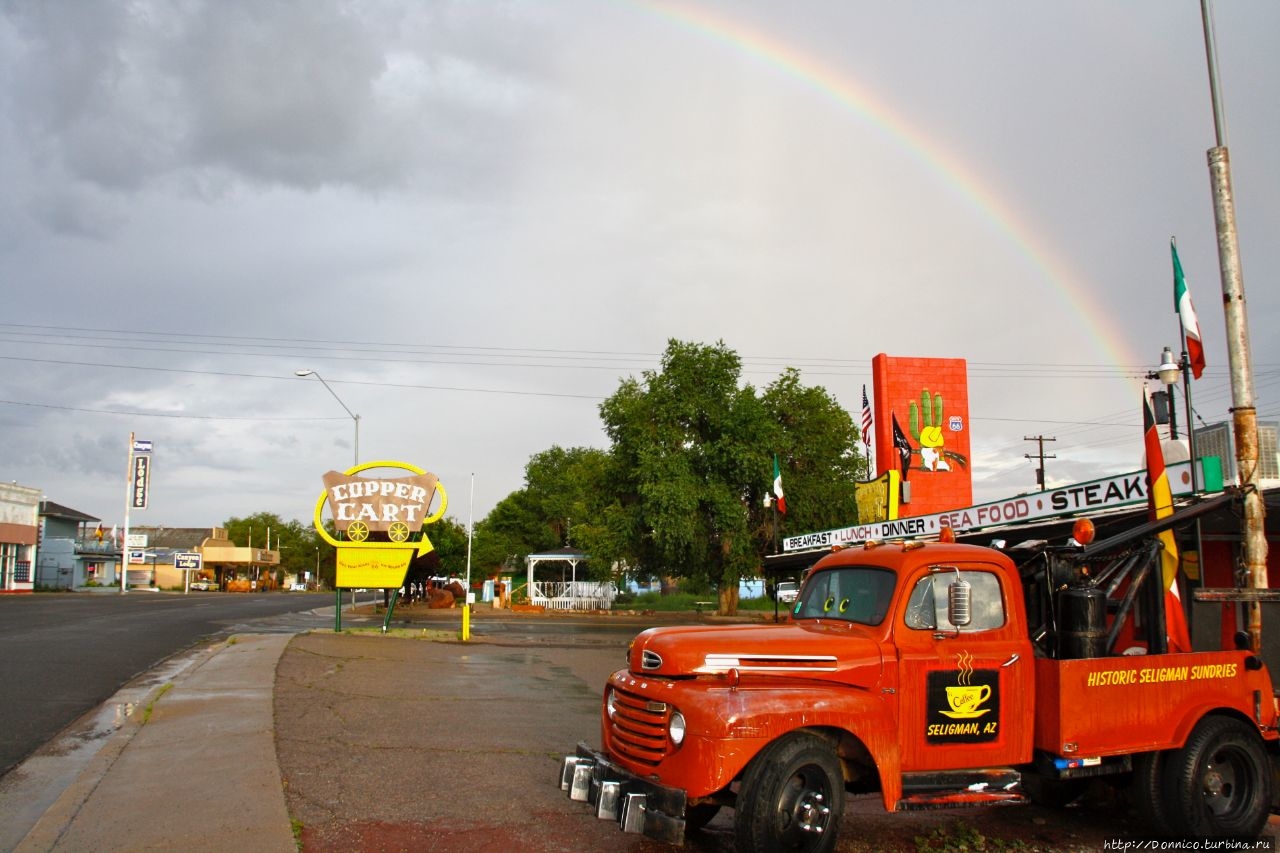 Пришельцы на летающем багги, мы приеехали в исторический город по марштуту 66 Селигман.Расстояние в 100 миль с лишком, для Харлеев это с одной стороны не проблема, но с другой все равно устаешь. И одним местом понимаешь, что гонка на сутки на получение заветного приза под названием "Железный зад" очевидно не для всех. Надо было немного потянуться, подвигаться и, свернув с интерстейта на сохранившийся кусок исторической трассы 66, Селигман пришелся нам как нельзя кстати.
