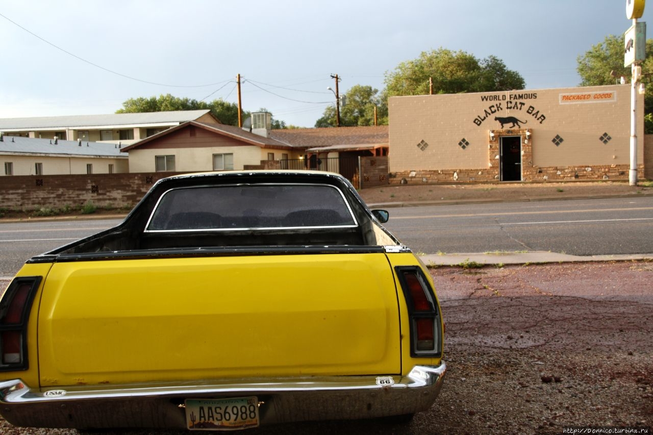 Это город из мультфильма "Тачки", которых здесь много. Поглядев на них, а также на железнодорожные пути, протянувшиеся вдоль всего этого вытянутого в струнку городка, мы пришли в себя уже достаточно, чтобы подумать о том, чего бы нам хотелось. И вот примерно в этой вот точке, ровно напротив того места, где мы припарковали свои байки, на нас с противоположной стороны дороги смотрел он самый — Бар черной кошки.