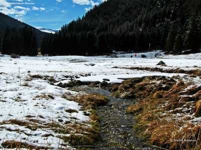 Внизу уже совсем была весна, солнце и ручей в долине среди снегов. Тут же красовалась маленькая, старинная и очень красивая церквушка. О ней я расскажу в другой раз.
