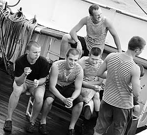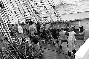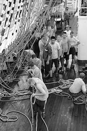 "Палубной команде и курсантам приготовиться к парусному авралу'" —