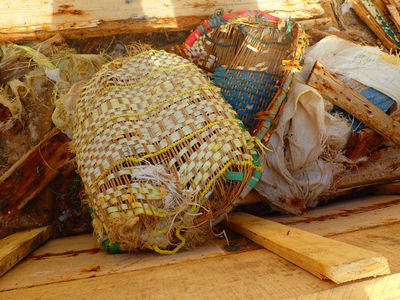 Затем с помощью вот таких корзин высыпают в лодку. Черпать не так легко, главное не зацепить с солью ещё и грунт.