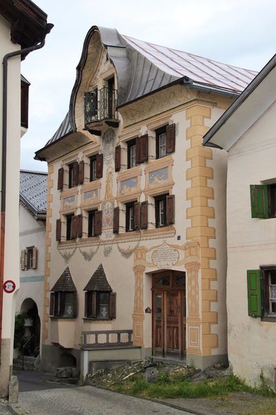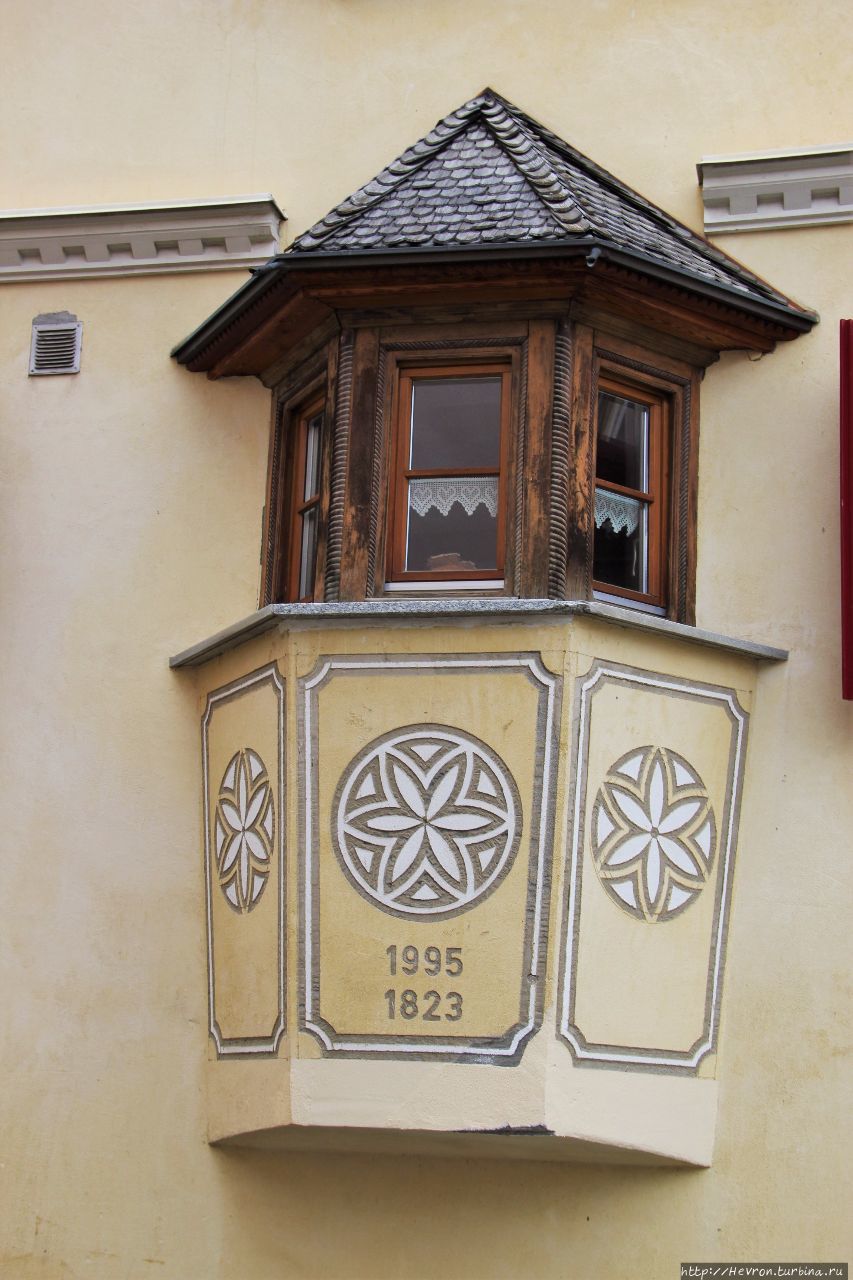 Городок имеет большую центральную площадь, на которой стоит фонтан. Дома вокруг площади в основном стоят тут с 1600-х гг. Они имеют очень необычную архитектуру. Каменные дома и деревянные балкончики, либо окна-балкончики. На многих домах сохранились сграффито. О сграффито подробнее я рассказывала в другой заметке