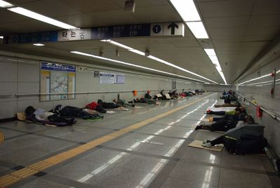 Это Азия. Обескураживает другое: если бы это происходило где-нибудь в Индии, Камбодже, ну или хотя бы во Вьетнаме, то выглядело бы естественно, но поскольку речь идет о развитой капиталистической стране, это впечатляет. В Японии, говорят, бомжи тоже есть, но они концентрируются в определенных местах: подземных переходах, парках и т.п. В Сеуле же они могут встретиться в любом месте.