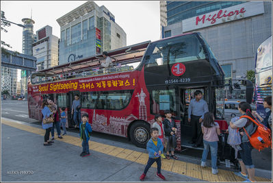 Тем более, что снимать на ходу автобуса широкоугольным объективом очень высокие дома — это еще тот аттракцион — все быстро разъезжается вправо и влево. Благо, на втором этаже были специальные места, куда, судя по всему, становятся фотографы или телеоператоры (это я так подумал). Они выступают чуть вперед, позволяя высовываться и видеть чуть дальше и шире, чем те, кто сидит.Сначала купим билеты на этот экскурсионный городской маршрут вот в этом месте, возле уже знакомого нам комплекса Донгдемун Плаза, по которому мы гуляли ночью, как по космическому кораблю. Билеты стоят от 5 до 12 тысяч вон на человека, что соответствует 5–12 долларам. Я не буду сейчас напрягать память и вспоминать, сколько точно стоили наши билеты, думаю, это не столь важная деталь.Есть автобусы одноэтажные, а есть двухэтажные с открытым верхом. Может, от этого и зависит стоимость. Вы выбрали по понятным причинам второй вариант и разместились наверху.Особенностью этого автобуса является 30 остановок в разных местах центра города, на любой из которых вы можете выйти, погулять и сесть на следующий подобный автобус, чтобы продолжить поездку. Схема очень знакомая всем, кто был в крупных городах мира.Пока мы не поехали — посмотрим на уже знакомые силуэты крупных торговых центров напротив. Автобусы курсируют с 9.00 утра до 20.00 вечера через каждые полчаса. Хотя, стоит отметить, что уже в октябре, когда мы были в Сеуле, темнеет довольно рано — в 18.00. Но, возможно, в темноте город выглядит еще наряднее, — мы в этом уже убедились.Итак поехали. Я не буду пересказывать то, о чем старательно рассказывала на английском девушка-экскурсовод. Я редко слушаю внимательно экскурсоводов, так как всегда занят процессом съемки. Так что рассказывать о городе я буду без привязки к конкретному месту.Сеул в его современном облике — город сравнительно молодой, как и сама страна Южная Корея. В 1945 году после Корейской войны (О ней мы поговорим в самом конце путешествия, когда вернемся вновь в Сеул и посетим интересные музеи города) страна была разделена на Северную и Южную части. Южную часть опекали Штаты. А Северную — СССР. К чему это привело — мы наблюдаем сегодня.В современном Сеуле проживает 11 миллионов (эта цифра в разных источниках может варьироваться как в большую, так и в меньшую стороны). Первое, что бросилось нам в глаза, это, практически, полное отсутствие старой архитектуры.Те районы, по которым мы ехали, были застроены высокими зданиями.Второе, что сразу бросается в глаза — это очень широкая планировка города — много пространства и площадей.По пути мы видим местного «гаишника» в зеленой накидке. Причина современного облика города весьма прозаична — это разрушения старого города во время войны. В 1950–51 годах около двухсот тысяч построек города были стерты с лица земли, поскольку город несколько раз переходил из рук в руки — то северокорейских, то китайских войск.Перед нами оригинальное современное здание с зеркальными стеклами. Если я не ошибаюсь, это новое здание мэрии. Во время войны в городе пострадало не меньше тысячи предприятий. Самый бурный экономический рост в стране наблюдался в 60-х годах ХХ века. Даже диву даешься, что за такой короткий срок корейцы так отстроили свою столицу. После войны в город хлынули беженцы со всей страны, сильно увеличив его население. Они, по всей вероятнос
