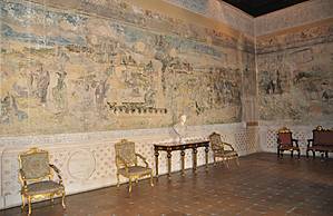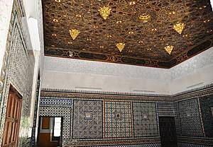 Зал Претория, расположенный при выходе из сада, декорирован великолепным кессонным потолком в мавританском стиле.