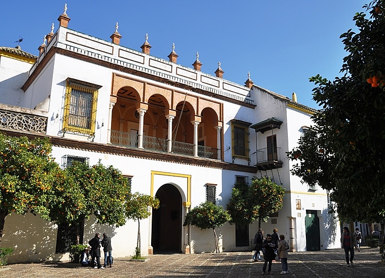 Главный дворик выполнен в мудехарском стиле, а вот фонтан, привезенный из Генуи и установленный в центре, исполнен в стиле ренессанс.