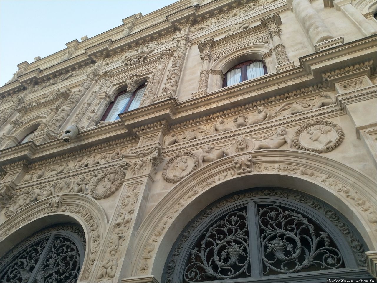 Фасад богато декорирован цветочным орнаментом, пилястрами, балюстрадой, рельефными изображениями исторических и мифических лиц