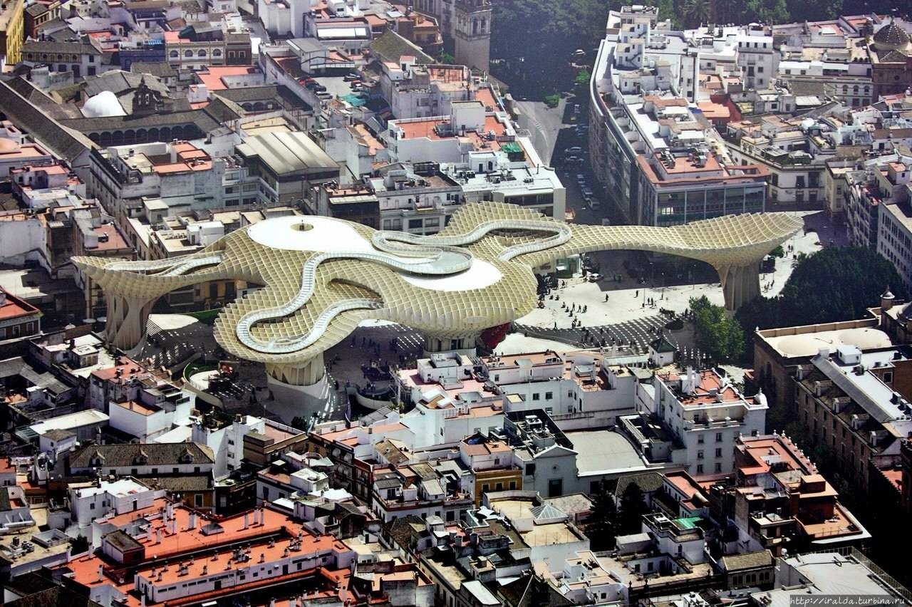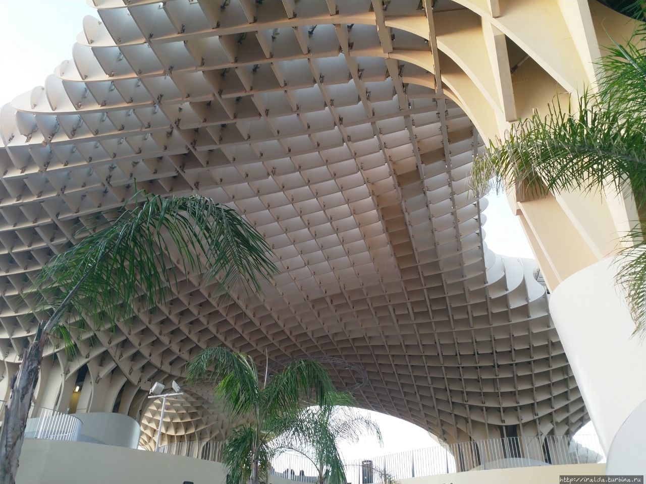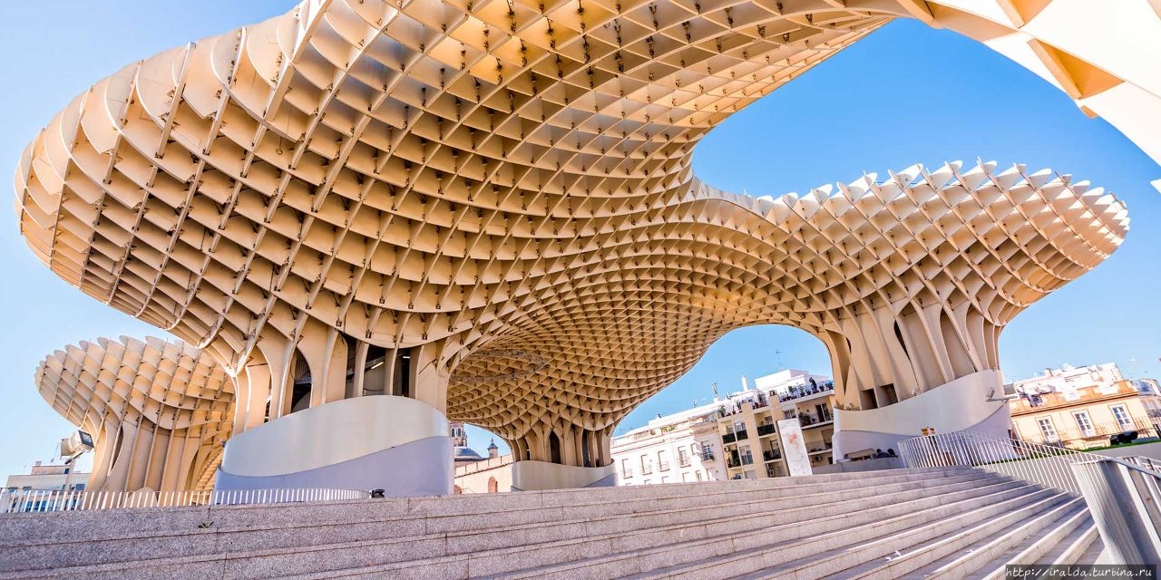 На создание такого оригинального и уникального строения Майера вдохновили своды Севильского собора и фикусовые деревья, столь популярные в Андалусии. Как утверждал сам архитектор, он хотел создать собор без стен, очень демократичный и столь понятный поколению ХХI века. Возможно, это смелое и амбициозное сравнение, но, действительно, в футуристических формах деревянного гиганта не меньше мощи и стати, чем в торжественных сводах готического храма.