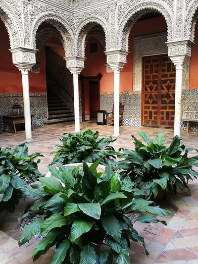 Входя во дворец, сразу попадаешь в большое патио- типичное андалусийское патио, украшенное 16 арками с лепниной в стиле «платереско» и мраморными колоннами.Такую же лепнину можно видеть и на окнах, выходящих во двор. Пол в патио тоже мраморный, в центре, по традиции, находится белый фонтан в арабском стиле. Стены на 1,5 метра выложены керамической плиткой, прекрасно сохранившейся.