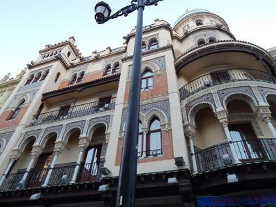 Венцом творения стал огромный отель "Альфонсо XIII", построенный к открытию Иберо-американской выставки 1929 года. На церемонии открытия присутствова король Испании Альфонсо 13й. Внутри мы не были, но в интернете можно найти множество интерьерных фото. Я вас уверяю, интерьер далеко превосходит экстерьер.